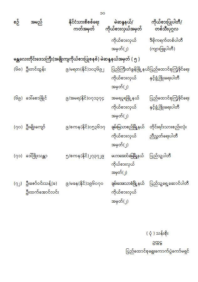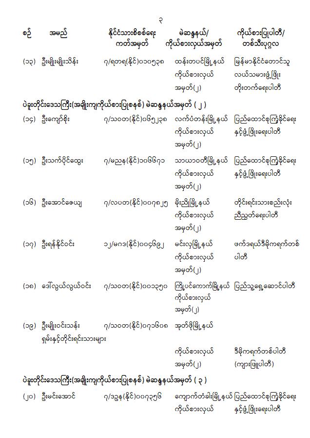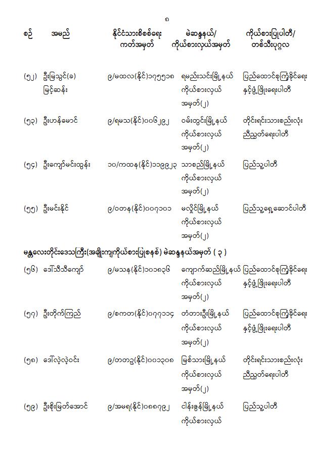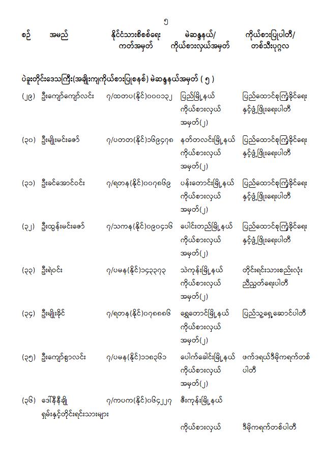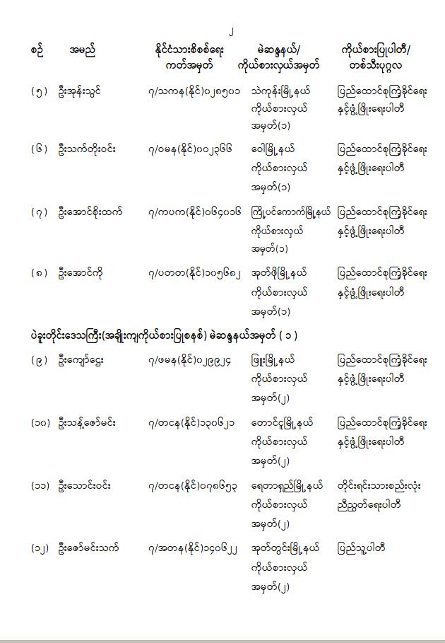၁။ ၂၀၂၁ ခုနှစ်၊ ဖေဖော်ဝါရီလမှစတင်၍ ပြည်ထောင်စုအဆင့်အဖွဲ့အစည်းများနှင့် ပြည်ထောင်စုဝန်ကြီးဌာနများမှ နိုင်ငံ့ဝန်ထမ်းအချို့သည် အကြောင်းအမျိုးမျိုးကြောင့် ခွင့်ပြုချက်မရရှိဘဲ လုပ်ငန်းခွင်ကို စွန့်ခွာသွားကြသည့်အတွက် သက်ဆိုင်ရာဌာနများ၏ အမည်မည်းစာရင်း (Black Lists)တွင် ပါဝင်နေ၍ စိုးရိမ်ပူပန်စိတ်ဖြင့် အခြားနေရာများသို့ ရှောင်တိမ်းနေကြောင်း သိရှိရပါသည်။