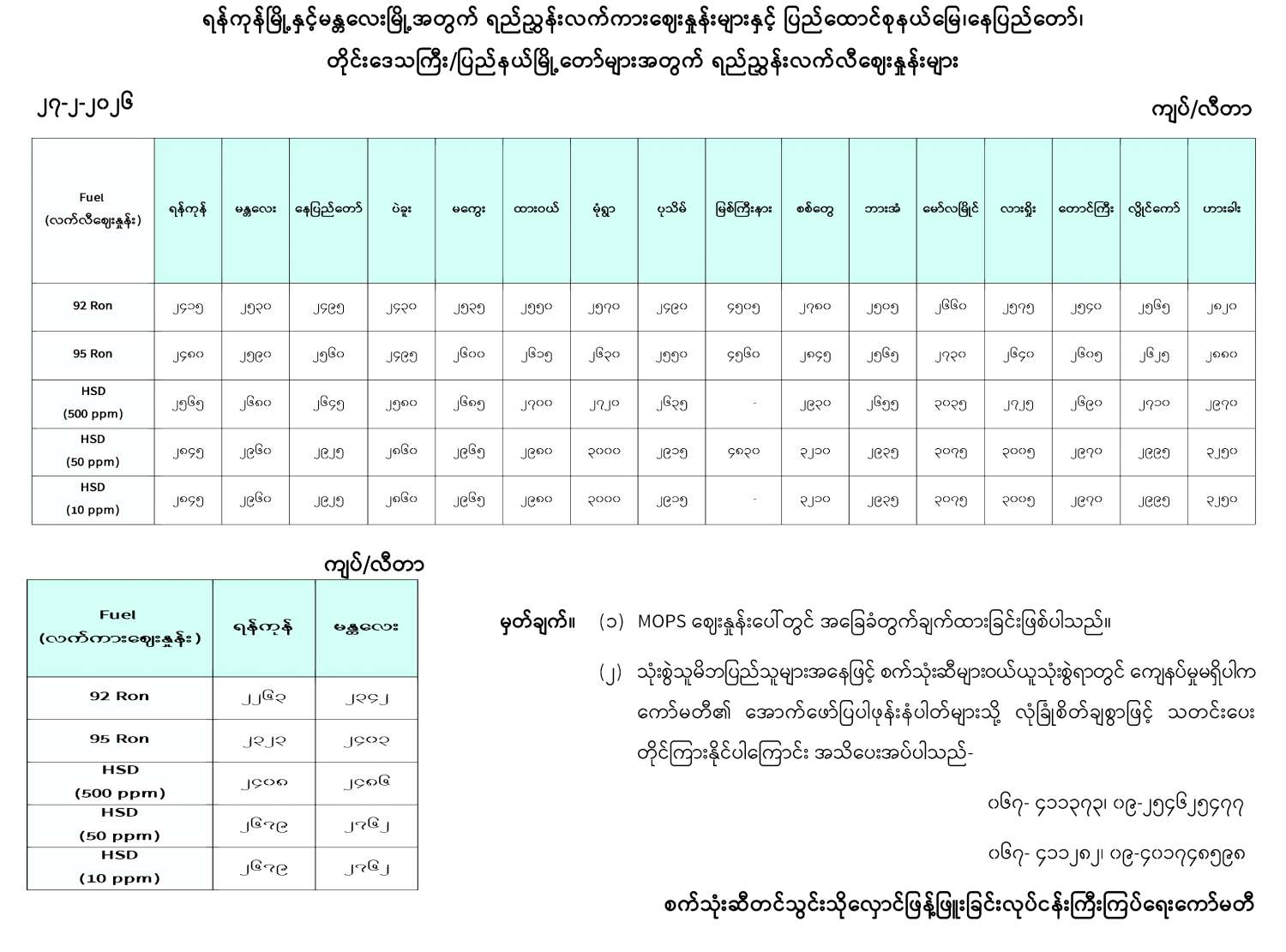 ရန်ကုန်မြို့နှင့် မန္တလေးမြို့အတွက် ရည်ညွှန်းလက်ကားဈေးနှုန်းများနှင့် ပြည်ထောင်စုနယ်မြေ နေပြည်တော်၊ တိုင်းဒေသကြီး/ပြည်နယ် မြို့တော်များအတွက် ရည်ညွှန်းလက်လီဈေးနှုန်းများ