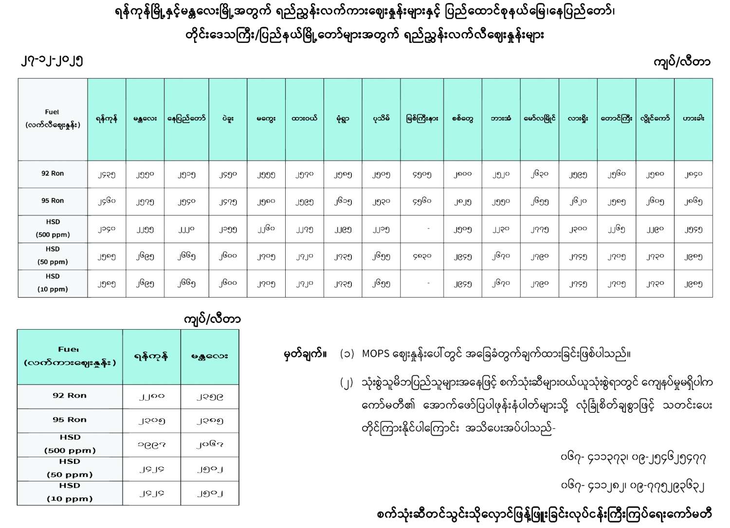 ရန်ကုန်မြို့နှင့် မန္တလေးမြို့အတွက် ရည်ညွှန်းလက်ကားဈေးနှုန်းများနှင့် ပြည်ထောင်စုနယ်မြေ နေပြည်တော်၊ တိုင်းဒေသကြီး/ ပြည်နယ် မြို့တော်များအတွက် ရည်ညွှန်းလက်လီဈေးနှုန်းများ