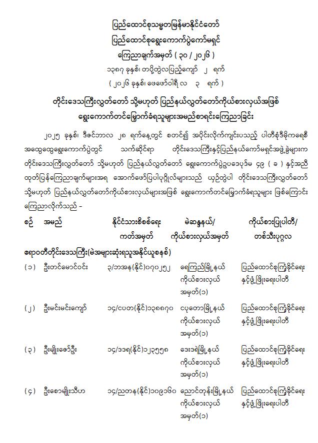 တိုင်းဒေသကြီးလွှတ်တော် သို့မဟုတ် ပြည်နယ်လွှတ်တော်ကိုယ်စားလှယ်အဖြစ် ရွေးကောက်တင်မြှောက်ခံရသူများ အမည်စာရင်းကြေညာခြင်း