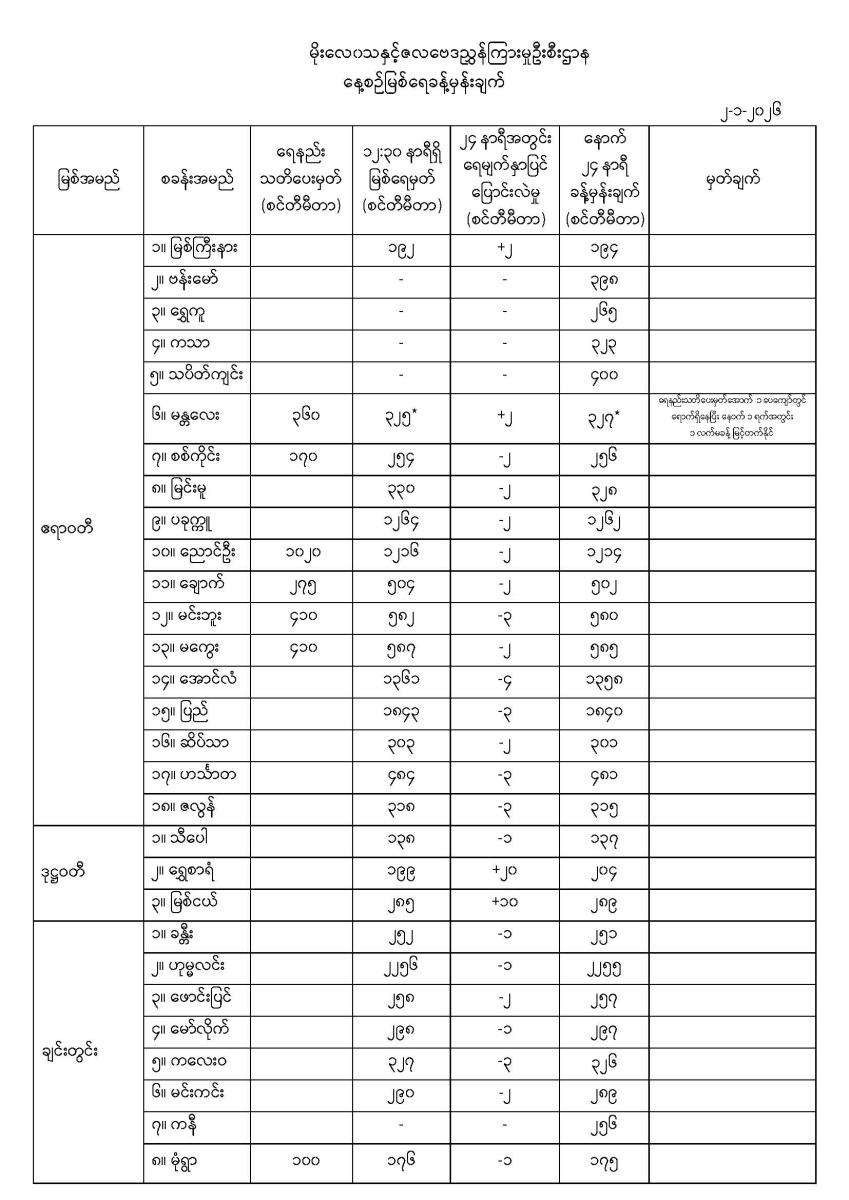 နေ့စဉ်မြစ်ရေခန့်မှန်းချက် ၂-၁-၂၀၂၆ ရက်နေ့ ၁၄:၀၀ နာရီအချိန်ထုတ်ပြန်ချက်