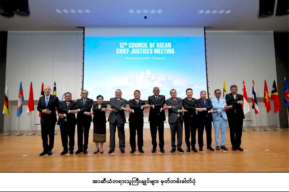 The Myanmar delegation, led by the Union Chief Justice, the Hon. U Tha Htay, attended the 12th Meeting of the Council of ASEAN Chief Justices at the Supreme Court of Singapore on November 15, 2025. At the opening session, the Union Chief Justice, the Hon. U Tha Htay, delivered a speech alongside other ASEAN Chief Justices, heads of delegation, and the ASEAN Deputy Secretary-General. Then CACJ Working Groups on the ASEAN Judiciaries Portal, Civil Proceedings, Case Management and Court Technology, Judicial Training and Education, Cross-border Disputes Involving Children, Conduct of Video Conferencing Hearings, ASEAN + Meetings and the Climate Justice presented their reports regarding the activities carried out, the achievements gained and the working plan to be continued and obtain formal approval. During the meeting, the Union Chief Justice, The Hon. U Tha Htay, discussed matters relating to the Myanmar judiciary.