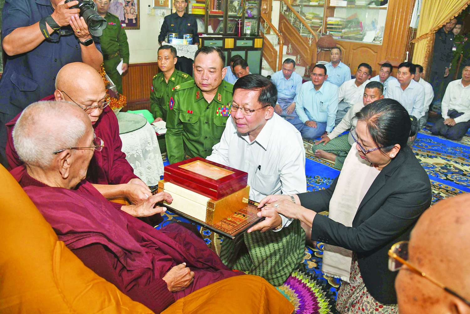 ဦးစွာ နိုင်ငံတော်ယာယီသမ္မတ နိုင်ငံတော်လုံခြုံရေးနှင့် အေးချမ်းသာယာရေးကော်မရှင်ဥက္ကဋ္ဌနှင့် ဇနီး၊ အဖွဲ့ဝင်များသည် ဆရာတော်ကြီးအား ဖူးမြော်ကြည်ညို၍ ဆရာတော်ကြီး၏ ကျန်းမာရေးဆိုင်ရာများနှင့် သာသနာတော်ထွန်းကားပြန့်ပွားရေးဆိုင်ရာများအား မေးမြန်းလျှောက်ထားပြီး လိုအပ်သည်များဖြည့်ဆည်းဆောင်ရွက်ပေးသည်။
