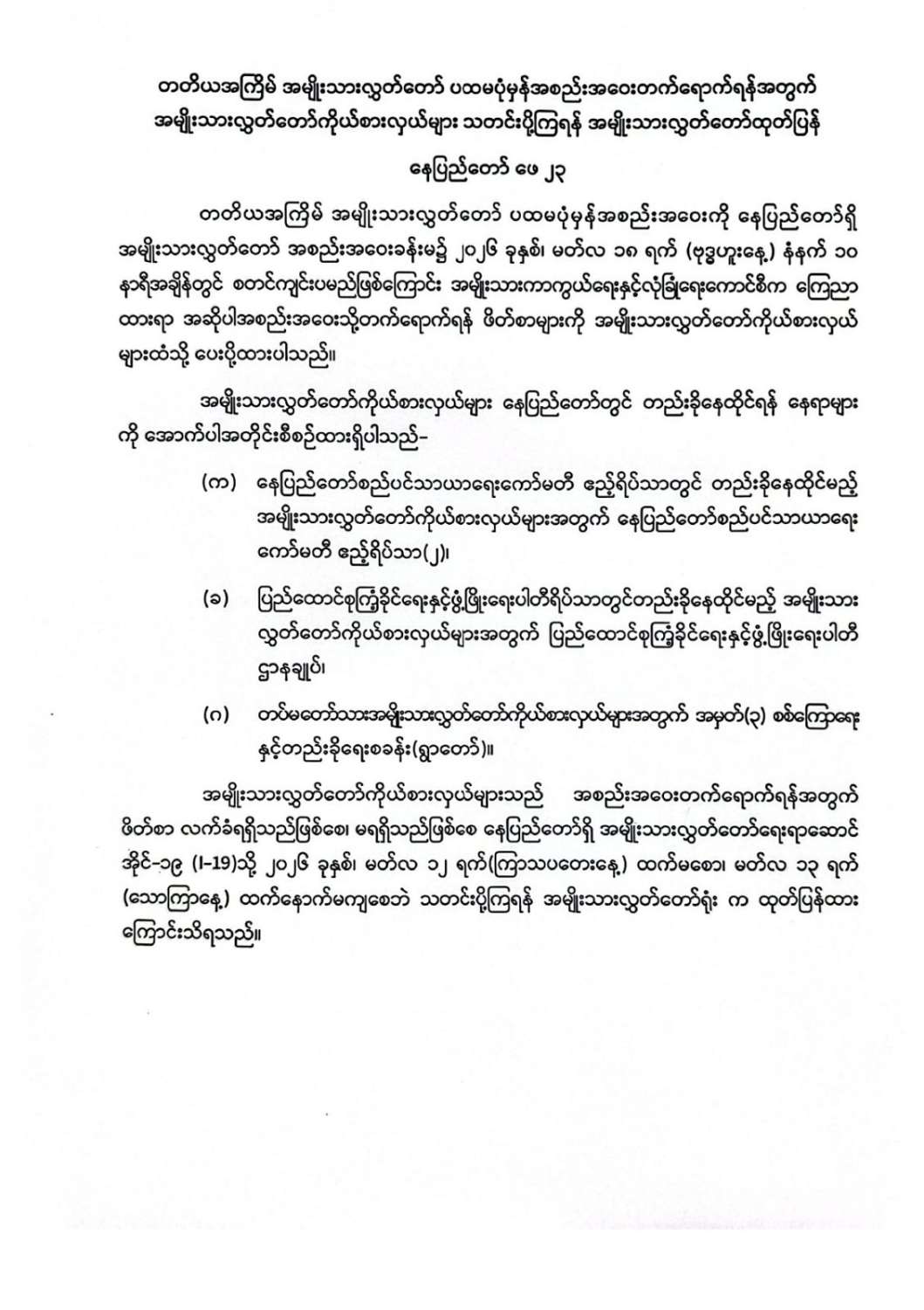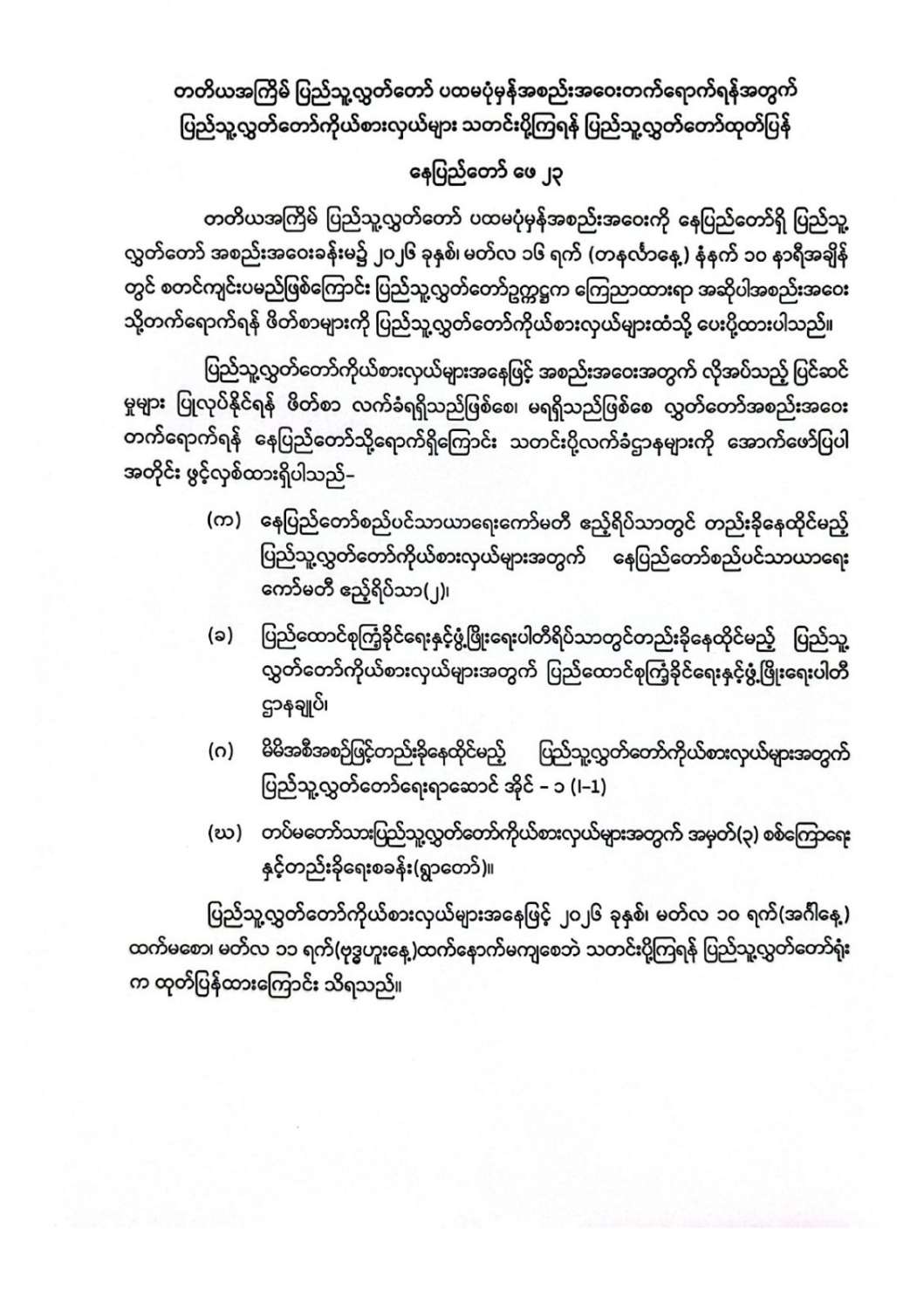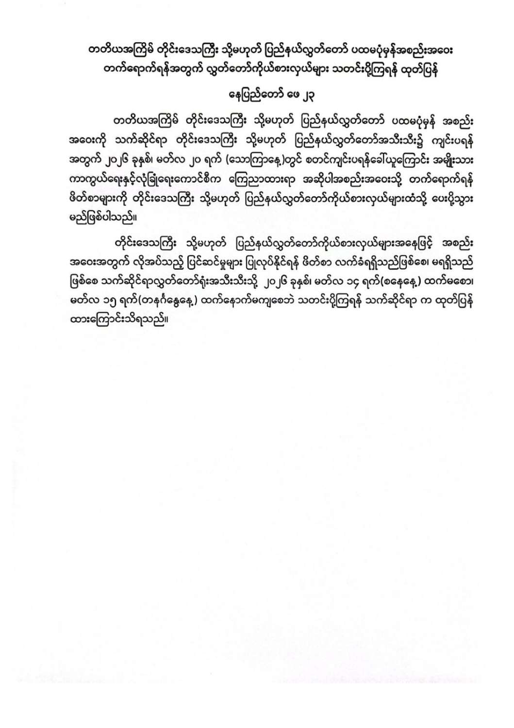 တတိယအကြိမ် တိုင်းဒေသကြီး သို့မဟုတ် ပြည်နယ်လွှတ်တော် ပထမပုံမှန်အစည်းအဝေးတက်ရောက်ရန်အတွက် လွှတ်တော်ကိုယ်စားလှယ်များ သတင်းပို့ကြရန် ထုတ်ပြန်