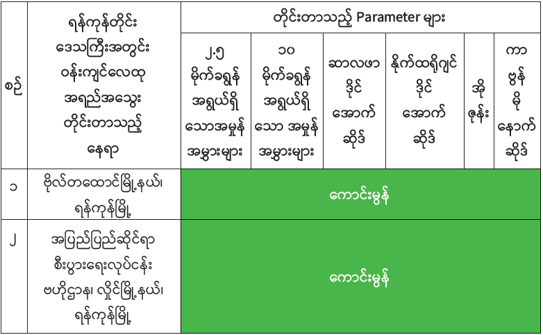 ရန်ကုန်တိုင်းဒေသကြီး၊ ပတ်ဝန်းကျင်ထိန်းသိမ်းရေးဦးစီးဌာနအနေဖြင့် ရန်ကုန်မြို့အတွင်း အောက်ဖော်ပြပါ တိုင်းတာမှတ် (၃) နေရာတွင် Ambient Air Quality Monitoring Station with Mobile Car- (AQMS Mobile Car)၊ Compact Air Quality Monitoring Station- (AQM 65) စက်များကို အသုံးပြု၍ Particulate Matter 2.5 (PM2.5)၊ Particulate Matter 10 (PM10) ၊ Sulphur Dioxide (SO2)၊ Nitro-gen Dioxide (NO2)၊ Ozone (O3) နှင့် Carbon Monoxide (CO) စသည့် အဓိက Parameter (၆) မျိုးကို (၂၄) နာရီ ပုံမှန်တိုင်းတာပြီး လေ့လာဆန်းစစ်လျက်ရှိပါသည်။