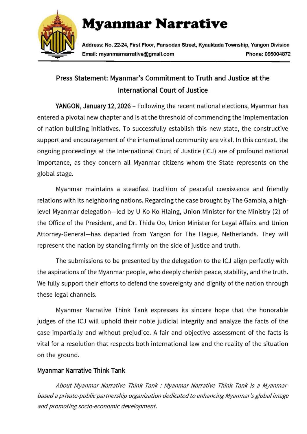 ရန်ကုန်မြို့၊ ၂၀၂၆ ခုနှစ်၊ ဇန်နဝါရီလ ၁၂ ရက် – မြန်မာနိုင်ငံသည် ရွေးကောက်ပွဲအပြီးတွင် သမိုင်းစာမျက်နှာအသစ်သို့ ကူးပြောင်းကာ နိုင်ငံတော်သစ် တည်ဆောက်ရေးလုပ်ငန်းစဉ်များကို စတင်ဖော်ဆောင်တော့မည့်အချိန်အခါဖြစ်ပါသည်။ ထိုသို့ နိုင်ငံသစ်တစ်ရပ်ကို အောင်မြင်စွာ တည်ဆောက်နိုင်ရန်အတွက် နိုင်ငံတကာအသိုက်အဝန်း၏ အပြုသဘောဆောင်သော အားပေးကူညီမှုများနှင့် ပူးပေါင်းဆောင်ရွက်မှုများသည် အထူးလိုအပ်လျက်ရှိပါသည်။ လက်ရှိတွင် အပြည်ပြည်ဆိုင်ရာတရားရုံး (ICJ) ၌ ရင်ဆိုင်နေရသော အမှုကိစ္စသည် မြန်မာနိုင်ငံကို ကိုယ်စားပြုသည့်အပြင် မြန်မာပြည်သူအားလုံး၏ အကျိုးစီးပွားနှင့် တိုက်ရိုက်သက်ဆိုင်သည့် ကိစ္စရပ်တစ်ခုလည်း ဖြစ်ပါသည်။