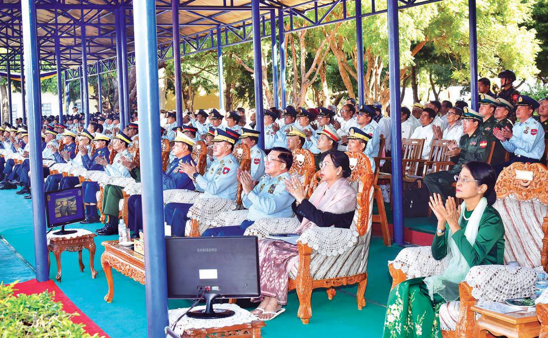ထို့နောက် လေယာဉ်၊ ရဟတ်ယာဉ်များက သရုပ်ပြအုပ်ဖွဲ့ပျံသန်း၍ တပ်မတော် ကာကွယ်ရေးဦးစီးချုပ်အား အလေးပြုကြသည်။