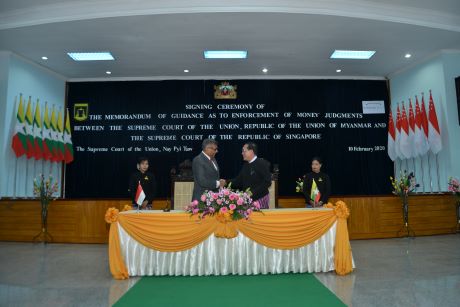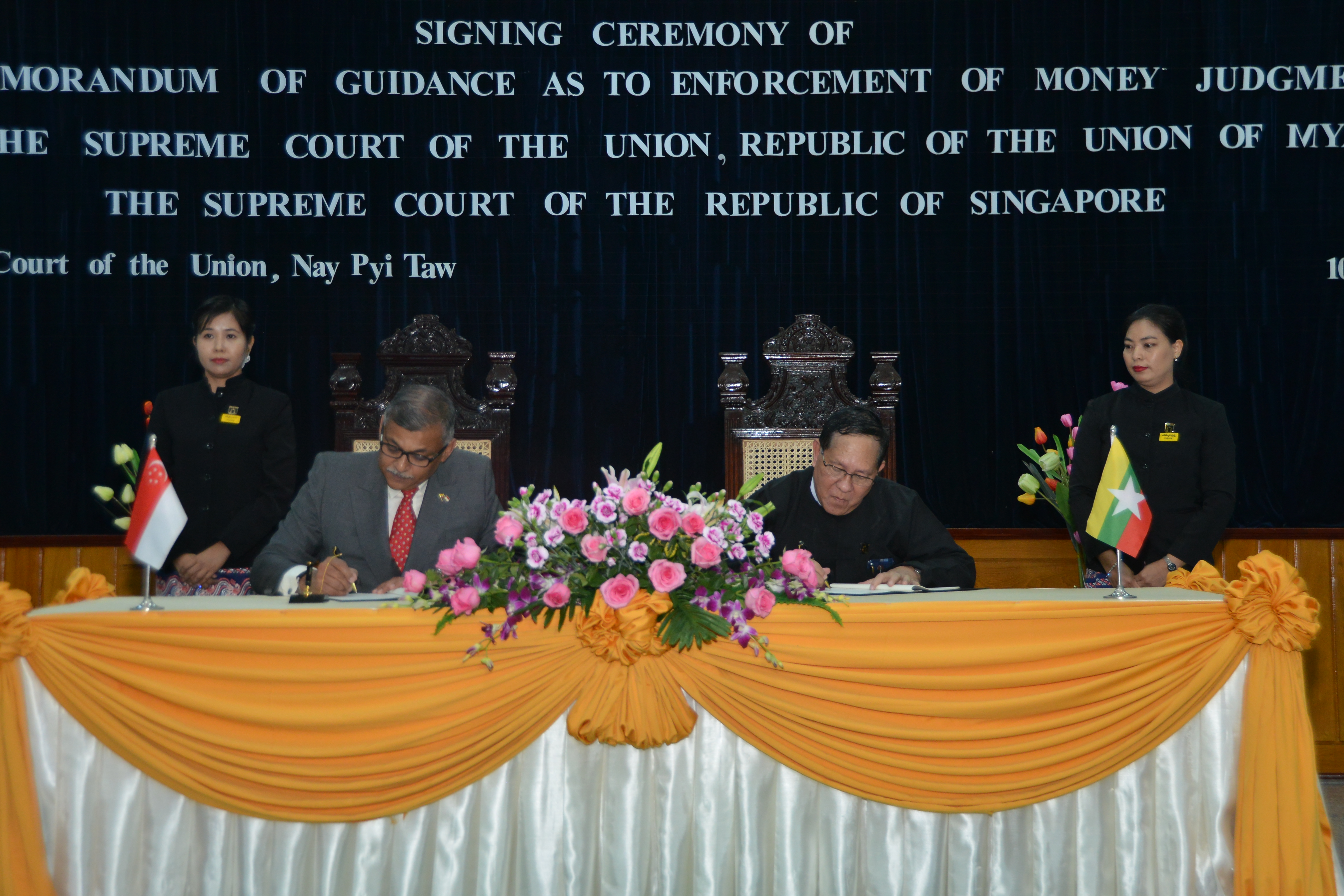 ပြည်ထောင်စုတရားလွှတ်တော်ချုပ်နှင့် စင်ကာပူသမ္မတနိုင်ငံ၊ တရားလွှတ်တော်ချုပ်တို့အကြား “ငွေကြေးဆိုင်ရာ စီရင်ချက်များ အတည်ပြုရန် လမ်းညွှန်မှုစာချွန်လွှာ” လက်မှတ်ရေးထိုး