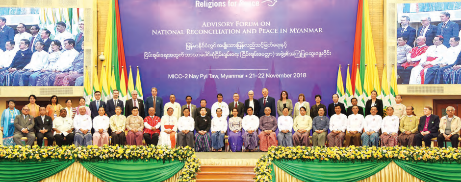 မြန်မာနိုင်ငံတွင် အမျိုးသားပြန်လည်သင့်မြတ်ရေးနှင့် ငြိမ်းချမ်းရေးအတွက် ဘာသာပေါင်းစုံ ငြိမ်းချမ်းရေး(ငြိမ်းချမ်းမေတ္တာ)အဖွဲ့၏ အကြံပြုဆွေးနွေးဝိုင်းကို (၂၁.၁၁.၂၀၁၈)ရက်နေ့ နံနက် ၉နာရီတွင် နေပြည်တော်ရှိ မြန်မာအပြည်ပြည်ဆိုင်ရာကွန်ဗင်းရှင်းဗဟိုဌာန-၂ ၌ ကျင်းပရာ နိုင်ငံတော်၏ အတိုင်ပင်ခံပုဂ္ဂိုလ် ဒေါ်အောင်ဆန်းစုကြည် တက်ရောက်၍ မိန့်ခွန်းပြောကြားသည်။