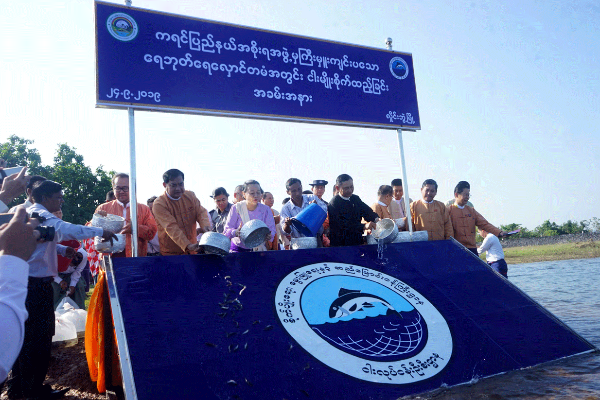 ရေကြီးနစ်မြုပ်ဆုံးရှုံးခဲ့သော ငါး၊ ပုဇွန်ကန်များအတွက် ငါးသားပေါက်များထောက်ပံ့ပေးအပ်ပြီး ရေဘုတ်ရေလှောင်တမံအတွင်း ငါးမြစ်ချင်းကောင်ရေ (၁)သိန်း ငါးမျိုးစိုက်ထည့်