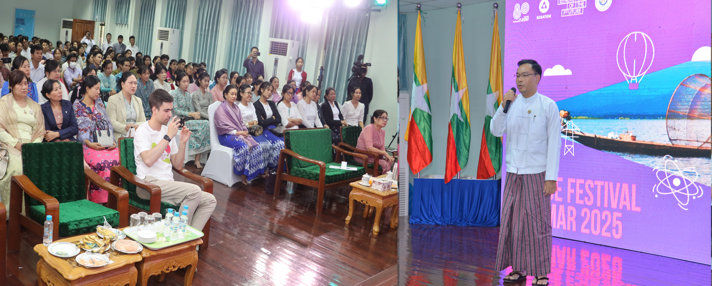 ရုရှားဖက်ဒရေးရှင်းနိုင်ငံ နိုင်ငံပိုင်အဏုမြူစွမ်းအင်ကော်ပိုရေးရှင်းအေဂျင်စီ (ROSATOM) နှင့် သိပ္ပံနှင့်နည်းပညာဝန်ကြီးဌာနတို့ ပူးပေါင်းစီစဥ်သော သိပ္ပံပွဲတော် ၂၀၂၅ (Science Festival 2025) တတိယနေ့ကို ယနေ့တွင် ရန်ကုန်မြို့ရှိ နျူကလီးယားနည်းပညာသတင်းအချက်အလက်စင်တာနှင့် ရန်ကုန်နည်းပညာတက္ကသိုလ်တို့တွင် ကျင်းပရာ သိပ္ပံနှင့်နည်းပညာဝန်ကြီးဌာန ဒုတိယဝန်ကြီး ဒေါက်တာအောင်ဇေယျ၊ အဏုမြူစွမ်းအင်ဦးစီးဌာနနှင့် အဆင့်မြင့်သိပ္ပံနှင့်နည်းပညာဦးစီးဌာနတို့မှ ညွှန်ကြားရေးမှူးချုပ်များ၊ ROSATOM နှင့် ရုရှားနိုင်ငံ National Research Nuclear University MEPhI (Moscow Engineering Physics Institute) တို့မှ တာဝန်ရှိသူများနှင့် ပါမောက္ခများ၊ ပညာရေးဝန်ကြီးဌာန နှင့် သိပ္ပံနှင့်နည်းပညာဝန်ကြီးဌာနတို့ရှိ တက္ကသိုလ်၊ ကောလိပ်နှင့် အခြေခံကျောင်းများမှ ပါမောက္ခများ၊ သုတေသီများ၊ ဆရာ၊ ဆရာမများ၊ ကျောင်းသား၊ ကျောင်းသူများနှင့် ဖိတ်ကြားထားသည့် ဧည့်သည်တော်များ ပေါင်း ၂၅၀ ဦးခန့် တက်ရောက်ကြသည်။