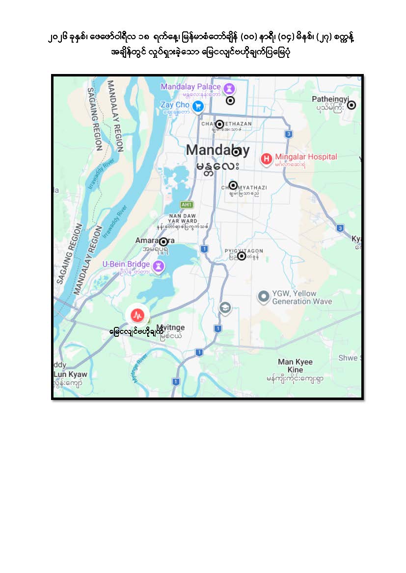 ၂၀၂၆ ခုနှစ်၊ ဖေဖော်ဝါရီ ၁၄ ရက်နှင့် ၁၅ ရက်က မကွေးတိုင်းဒေသကြီး၊ မကွေးမြို့နယ်၊ ရှမ်းပြည်နယ်၊ ညောင်ရွှေမြို့နယ်နှင့်.............................