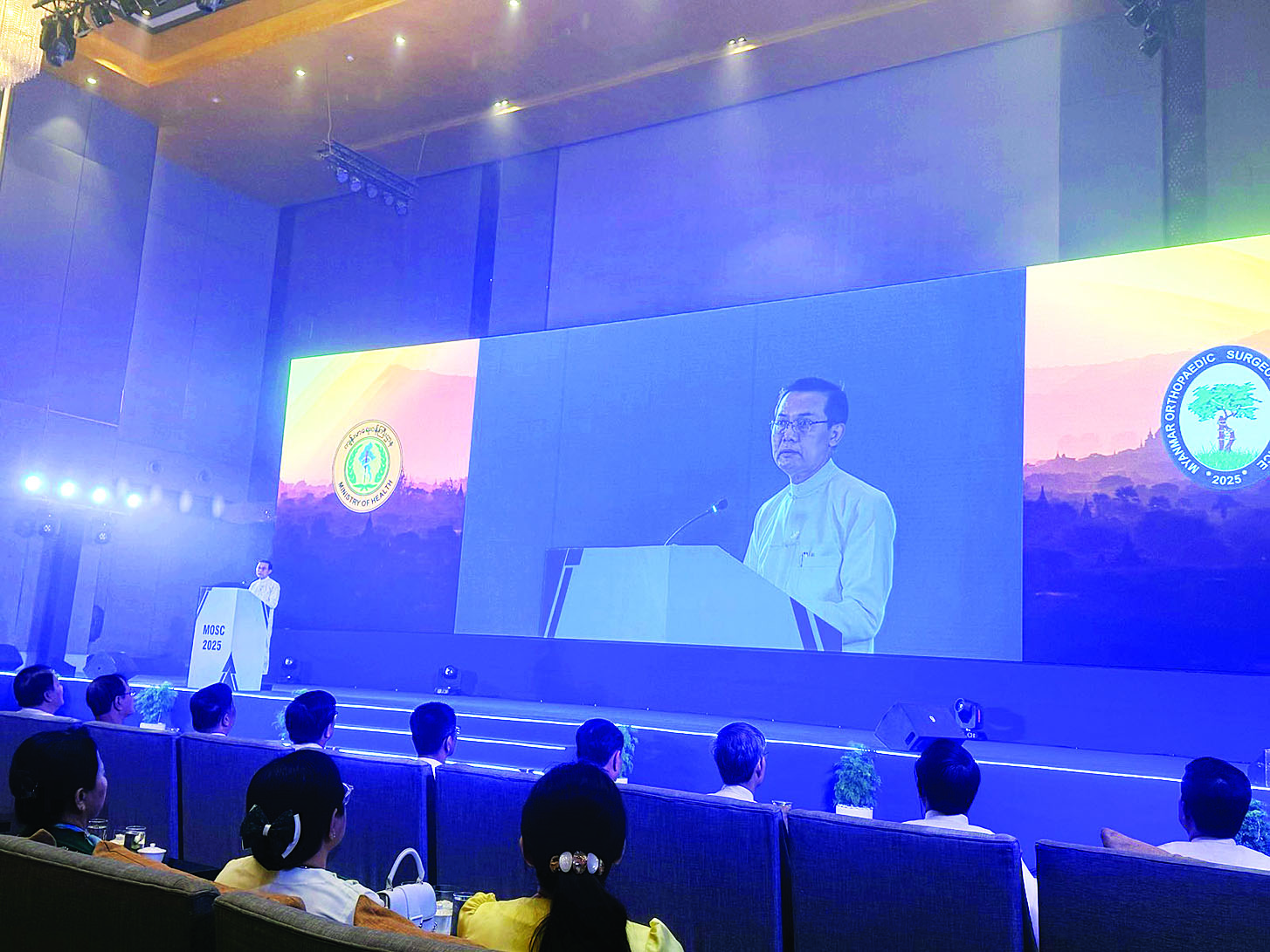 ကျန်းမာရေးဝန်ကြီးဌာန၏ ဦးဆောင်ပံ့ပိုးမှုများဖြင့် မြန်မာနိုင်ငံ အရိုးရောဂါပညာရပ်ဆိုင်ရာ ညီလာခံ (၂၀၂၅) ကို ရန်ကုန်မြို့ Novotel Hotel ၌ အောက်တိုဘာ ၃၀ ရက်မှ ၃၁ ရက်အထိ ကျင်းပရာ ညီလာခံဖွင့်ပွဲအခမ်းအနားကို ကျန်းမာရေးဝန်ကြီးဌာန ဒုတိယဝန်ကြီး ပါမောက္ခဒေါက်တာအေးထွန်း တက်ရောက်၍ ညီလာခံကျင်းပပြုလုပ်ခြင်းအားဖြင့် ရရှိလာသော တိုးတက်လာသည့် နည်းပညာသစ်များဖြင့် ပြည်သူလူထု၏ ကျန်းမာရေးစောင့်ရှောက်မှုများကို စိတ်ကောင်းစေတနာထား၍ ပိုမိုဆောင်ရွက်ပေးကြရန်နှင့် အရိုးရောဂါပညာရပ်များကို စဉ်ဆက်မပြတ်တိုးတက်စေရန် အားလုံးပူးပေါင်းဆောင်ရွက်ကြရန် အမှာစကားပြောကြားသည်။