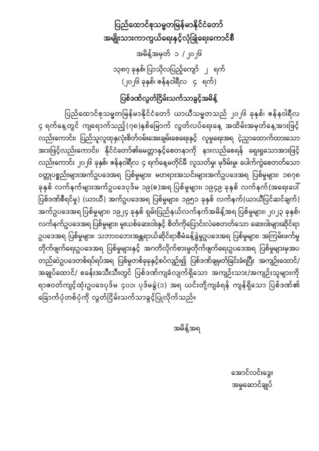 ရန်ကုန်မြို့နှင့် မန္တလေးမြို့အတွက် ရည်ညွှန်းလက်ကားဈေးနှုန်းများနှင့် ပြည်ထောင်စုနယ်မြေ နေပြည်တော်၊ တိုင်းဒေသကြီး/ပြည်နယ် မြို့တော်များအတွက် ရည်ညွှန်းလက်လီဈေးနှုန်းများ