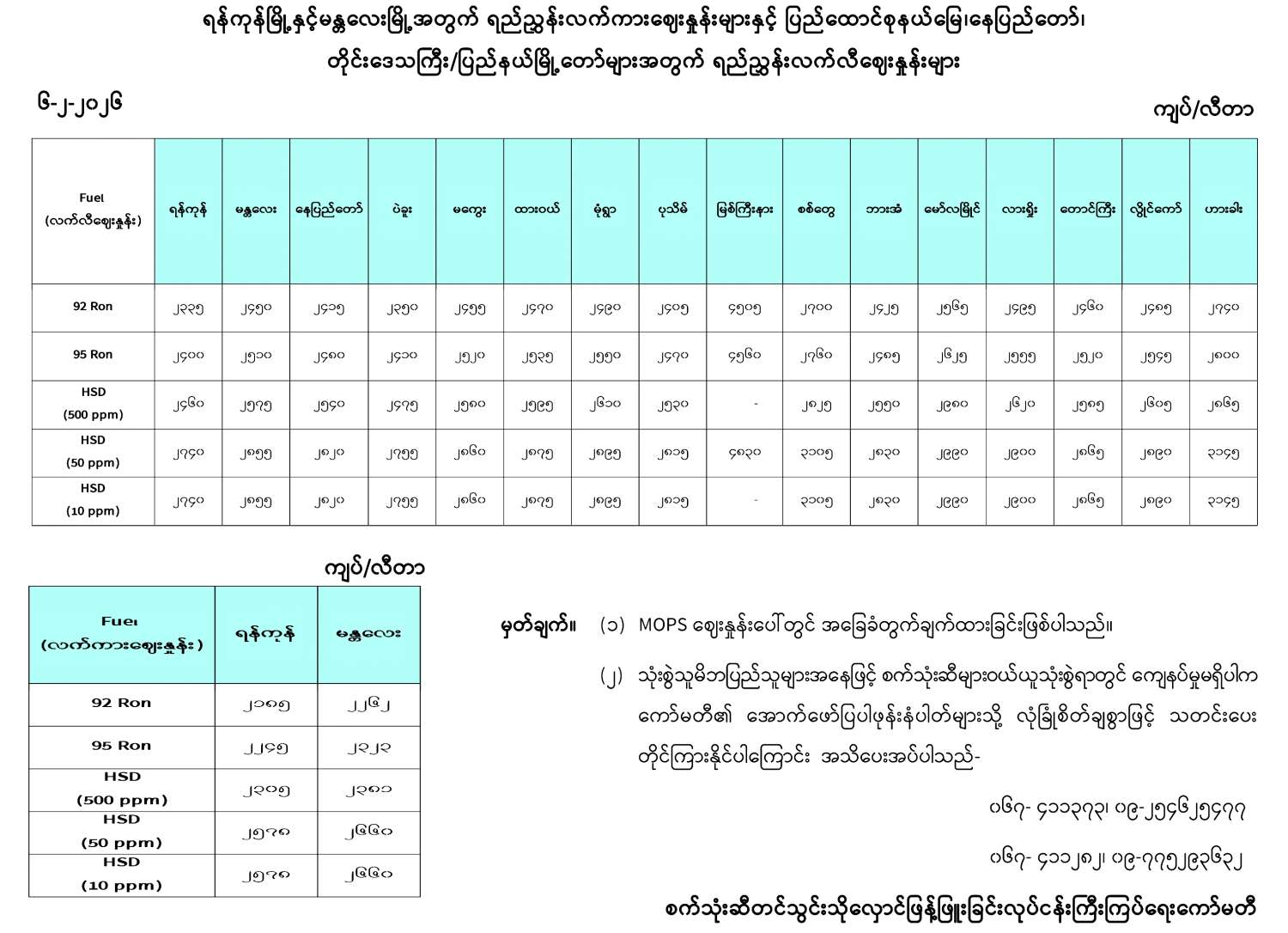 ရန်ကုန်မြို့နှင့် မန္တလေးမြို့အတွက် ရည်ညွှန်းလက်ကားဈေးနှုန်းများနှင့် ပြည်ထောင်စုနယ်မြေ နေပြည်တော်၊ တိုင်းဒေသကြီး/ ပြည်နယ် မြို့တော်များအတွက် ရည်ညွှန်းလက်လီဈေးနှုန်းများ