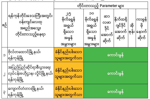 ရန်ကုန်တိုင်းဒေသကြီး ပတ်ဝန်းကျင်ထိန်းသိမ်းရေးဦးစီးဌာနအနေဖြင့် ရန်ကုန်မြို့အတွင်း အောက်ဖော်ပြပါ တိုင်းတာမှတ် (၃) နေရာတွင် Ambient Air Quality Monitoring Station with Mobile Car- (AQMS Mobile Car) ၊ Compact Air Quality Monitoring Station- (AQM 65) စက်များကို အသုံးပြု၍ Particulate Matter 2.5 (PM2.5) ၊ Particulate Matter 10 (PM10) ၊ Sulphur Dioxide (SO2) ၊ Nitrogen Dioxide (NO2)၊ Ozone (O3) နှင့် Carbon Monoxide (CO) စသည့် အဓိက Parameter (၆) မျိုးကို (၂၄) နာရီ ပုံမှန်တိုင်းတာပြီး လေ့လာဆန်းစစ်လျက်ရှိပါသည်။