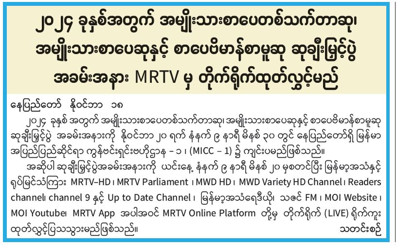 ၂၀၂၄ ခုနှစ်အတွက် အမျိုးသားစာပေတစ်သက်တာဆု၊ အမျိုးသားစာပေဆုနှင့် စာပေဗိမာန်စာမူဆု ဆုချီးမြှင့်ပွဲ အခမ်းအနား MRTV မှ တိုက်ရိုက်ထုတ်လွှင့်မည်