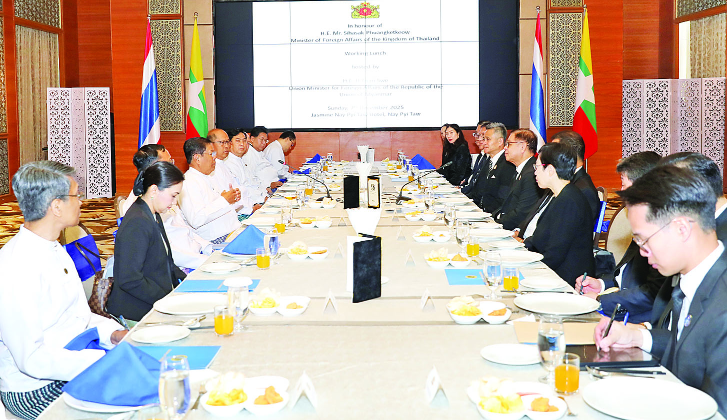 နိုင်ငံခြားရေးဝန်ကြီးဌာန ပြည်ထောင်စုဝန်ကြီး ဦးသန်းဆွေသည် ယနေ့တွင် နေပြည်တော်သို့ နေ့ချင်းပြန်ခရီးလာရောက်ခဲ့သည့် ထိုင်းနိုင်ငံခြားရေးဝန်ကြီး H.E. Mr. Sihasak Phuangketkeow နှင့် တွေ့ဆုံဆွေးနွေးပြီး ၎င်းနှင့်ကိုယ်စားလှယ်အဖွဲ့အား Jasmine Nay Pyi Taw Hotel ၌ အလုပ်သဘောနေ့လယ်စာဖြင့် တည်ခင်းဧည့်ခံသည်။