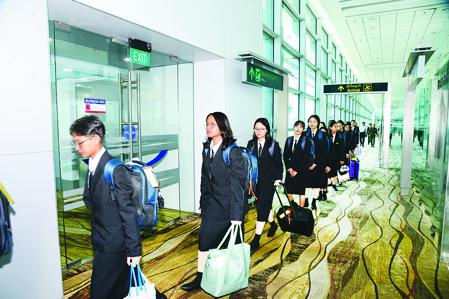 နိုင်ငံတော်လုံခြုံရေးနှင့်အေးချမ်းသာယာရေးကော်မရှင်ဥက္ကဋ္ဌ တပ်မတော်ကာကွယ်ရေးဦးစီးချုပ်၏ လမ်းညွှန်မှုဖြင့် တရုတ်ပြည်သူ့သမ္မတနိုင်ငံသို့ အောက်တိုဘာ ၁၃ ရက်မှစတင်၍ လေ့လာရေးခရီး သွားရောက်လျက်ရှိသည့် ၂၀၂၄-၂၀၂၅ ပညာသင်နှစ် တက္ကသိုလ်ဝင်စာမေးပွဲတွင် ထူးချွန်စွာအောင်မြင်ခဲ့ကြသည့် စစ်မှုထမ်းဆဲ/ စစ်မှုထမ်းဟောင်းနှင့် အစားခန့်ဝန်ထမ်းများ၏ သား/သမီး ကျောင်းသား ကျောင်းသူများနှင့် ဂုဏ်ထူးဖြင့် အောင်မြင်ခဲ့သော စစ်သည်များပါဝင်သည့် မျိုးဆက်သစ်ထူးချွန်လူငယ်မောင်မယ်များ ပါဝင်သော လေ့လာရေးအဖွဲ့သည် ယနေ့နံနက်ပိုင်းတွင် ရန်ကုန်မြို့သို့ ပြန်လည်ရောက်ရှိကြရာ ရန်ကုန်တိုင်းစစ်ဌာနချုပ် ဒုတိယတိုင်းမှူး ဗိုလ်မှူးချုပ် ထွန်းထွန်းဦးနှင့် တပ်မတော်အရာရှိကြီးများ၊ မြန်မာ့စီးပွားရေးဦးပိုင်အများနှင့် သက်ဆိုင်သော ကုမ္ပဏီလီမိတက်မှ ဌာနကြီးမှူး ဦးအောင်ရဲဝင်းနှင့် တာဝန်ရှိသူများ၊ ကျောင်းသား ကျောင်းသူများ၏ မိဘဆွေမျိုးများက လေဆိပ်၌ ကြိုဆိုနှုတ်ဆက်ကြသည်။
