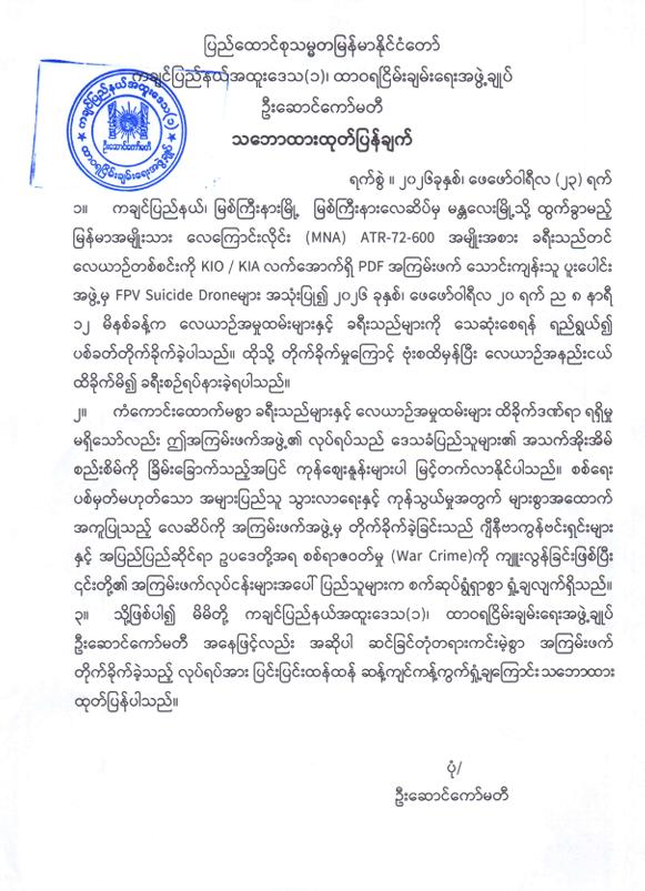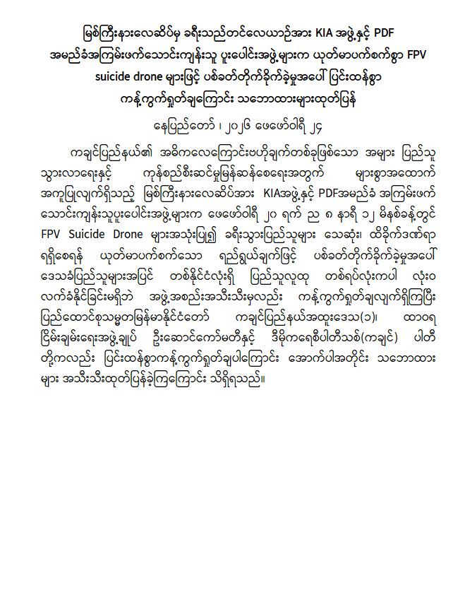 မြစ်ကြီးနားလေဆိပ်မှ ခရီးသည်တင်လေယာဉ်အား KIA အဖွဲ့နှင့် PDF အမည်ခံ အကြမ်းဖက်သောင်းကျန်းသူ ပူးပေါင်းအဖွဲ့များက ယုတ်မာပက်စက်စွာ FPV suicide drone များဖြင့် ပစ်ခတ်တိုက်ခိုက်ခဲ့မှုအပေါ် ပြင်းထန်စွာ ကန့်ကွက်ရှုတ်ချကြောင်း သဘောထားများထုတ်ပြန်