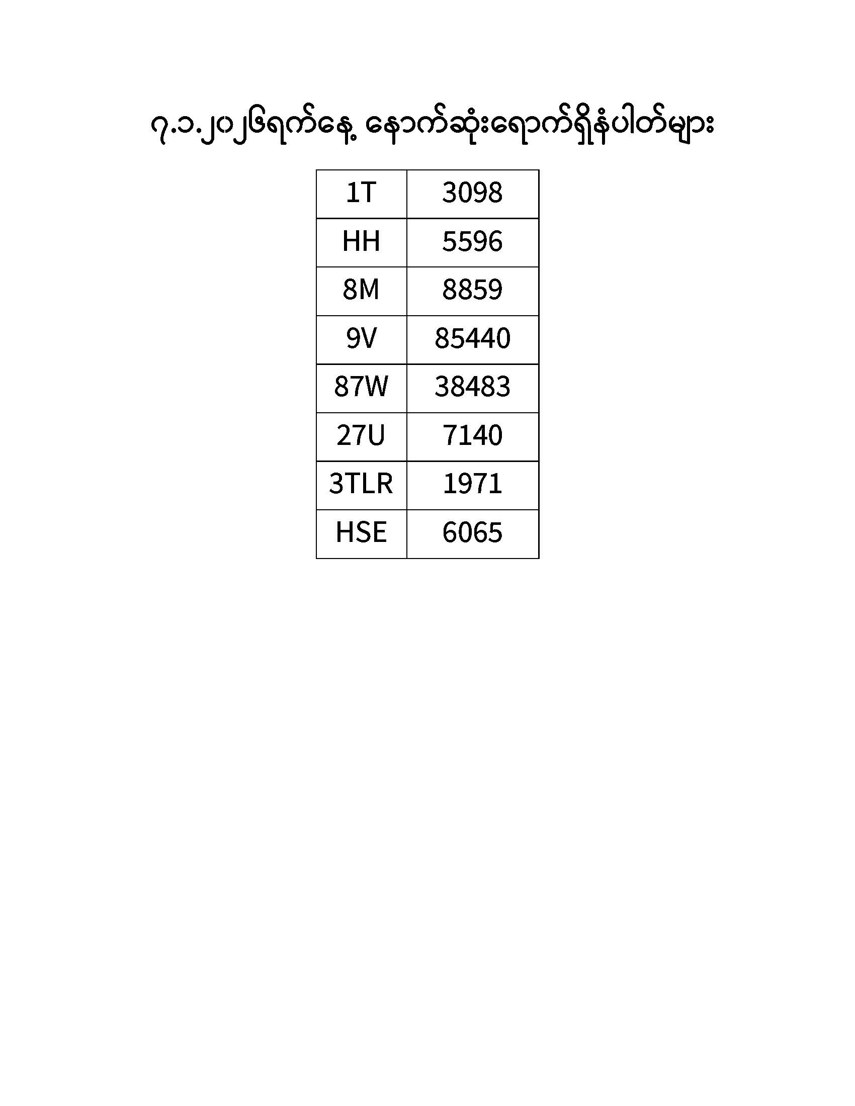 ၇.၁.၂၀၂၆ ရက်နေ့ထိ နောက်ဆုံးရောက်ရှိ နံပါတ်များ