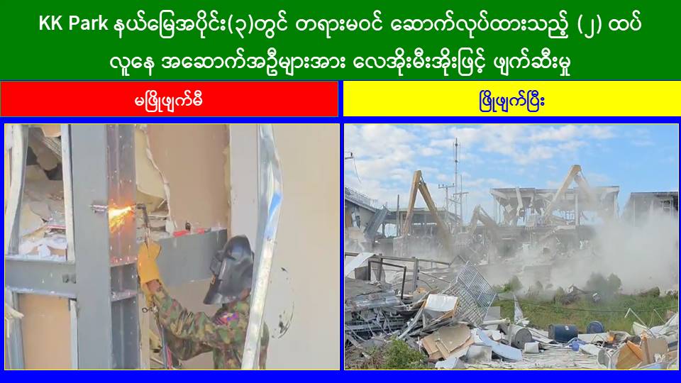 ထိုသို့ အွန်လိုင်းလိမ်လည်လောင်းကစားမှုတိုက်ဖျက်ရေးလုပ်ငန်းများ ဆောင်ရွက်လျက်ရှိရာ ယနေ့တွင် မြဝတီ-မဲထော်သလေး (KK Park) နယ်မြေအတွင်းရှိ အွန်လိုင်း လိမ်လည်လောင်းကစားမှုများ ကျူးလွန်ရာတွင် အသုံးပြုခဲ့သည့် အပိုင်း (၃) နယ်မြေအတွင်းရှိ တရားမဝင် ၄ ထပ်အဆောက်အအုံ ၃ လုံးကို ထပ်မံဖြိုချဖျက်ဆီးခဲ့သဖြင့် KK Park နယ်မြေအတွင်းရှိ တရားမဝင် အဆောက်အအုံ စုစုပေါင်း ၆၃၅ လုံး အနက် ၄၉၁ လုံးကို စနစ်တကျ ဖြိုချဖျက်ဆီးပြီးဖြစ်ကြောင်း သိရှိရသည်။ အဆိုပါ KK Park နယ်မြေအတွင်းရှိ အဆောက်အအုံများအနက် ယာဉ်ယန္တရားများ အသုံးပြု၍ ဖြိုချဖျက်ဆီးခြင်းများ ဆောင်ရွက်ပြီးစီးခဲ့သည့် တရားမဝင်အဆောက်အအုံများကို အလုံးစုံပျက်စီးစေရန်အတွက် လေအိုးမီးအိုးဖြင့် ထပ်မံဖျက်ဆီးခြင်းများကိုလည်း ဒီဇင်ဘာ ၁၄ ရက်မှ စတင်ဆောင်ရွက် ခဲ့ရာ ယနေ့တွင် ၂ ထပ်အဆောက်အအုံ ၅ လုံးကို ထပ်မံဖျက်ဆီးနိုင်ခဲ့သဖြင့် စုစုပေါင်း ၂ ထပ် အဆောက်အအုံ ၄၁ လုံးကို ရာခိုင်နှုန်းပြည့် ဖျက်ဆီးပြီးဖြစ်ကြောင်း သိရှိရသည်။