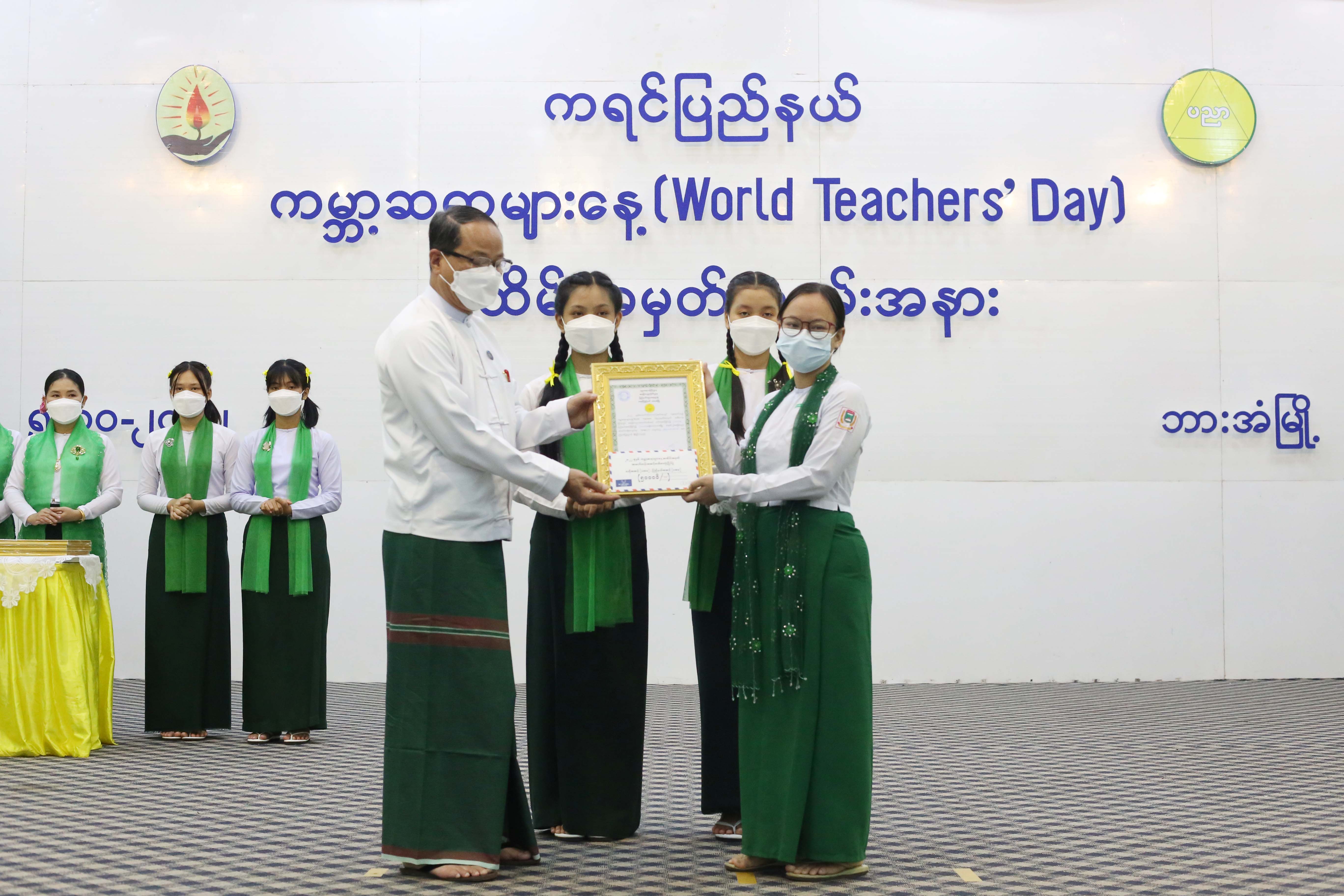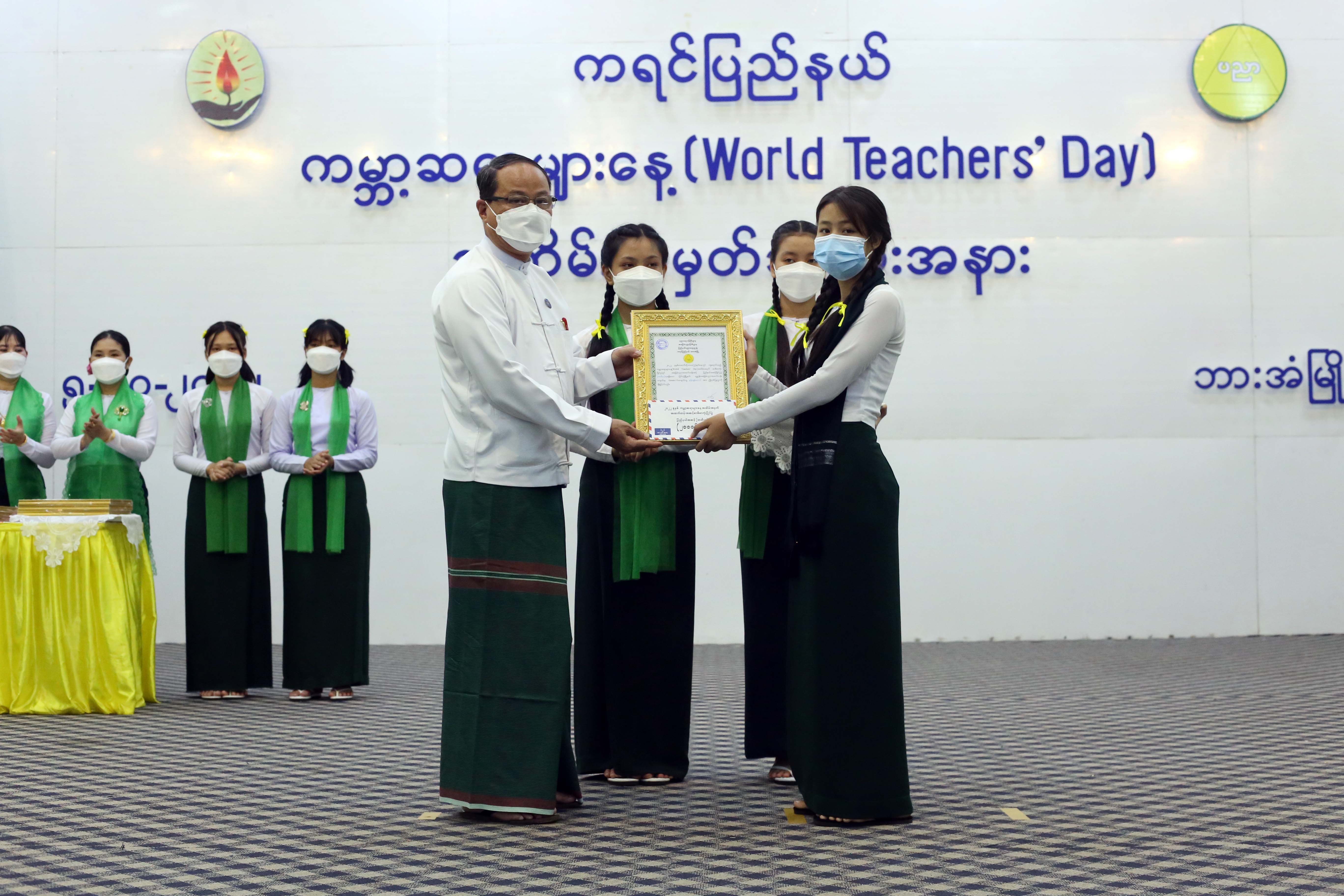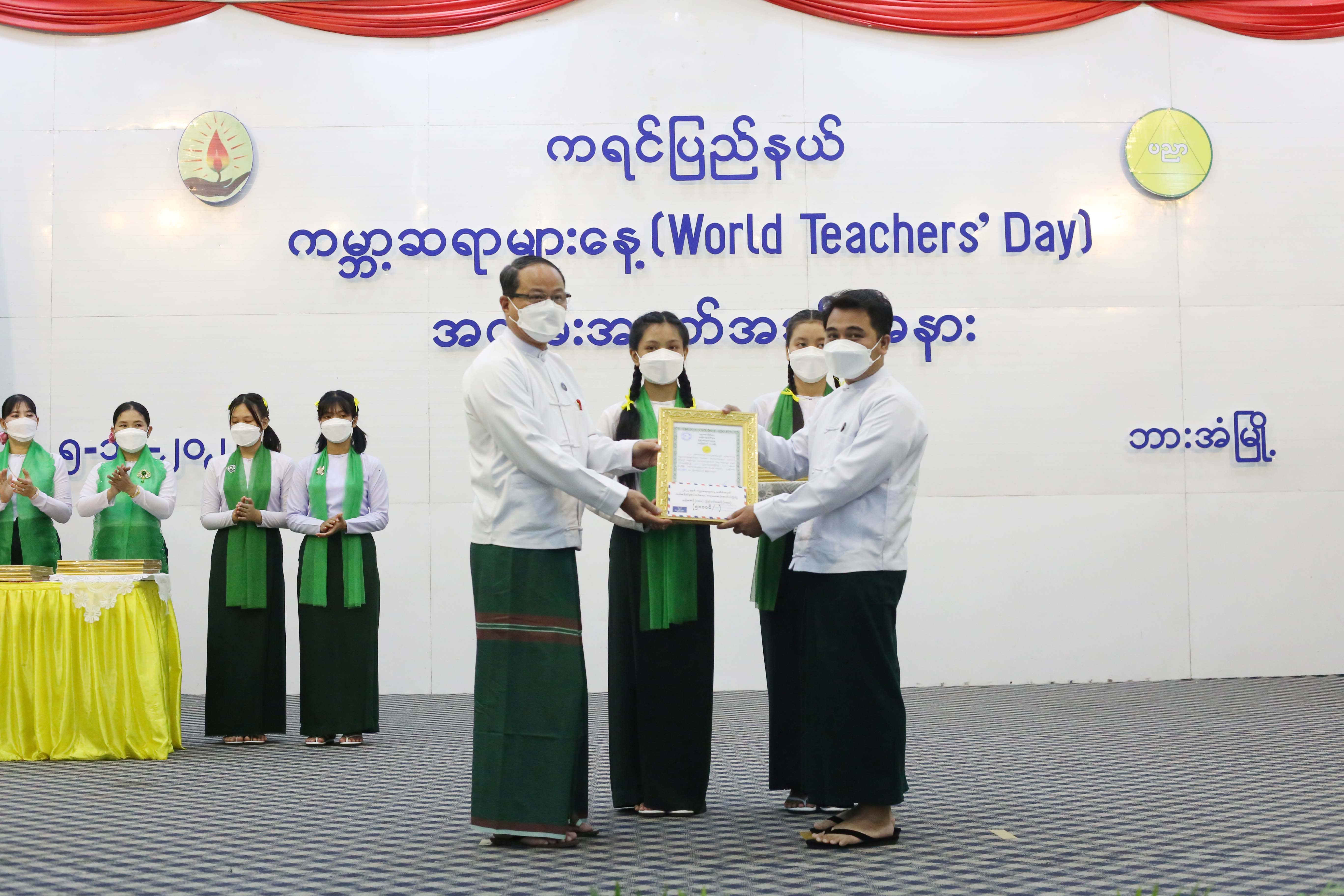 “ပညာရေးပြုပြင်ပြောင်းလဲမှု-ဆရာများကအစပြု” ဆောင်ပုဒ်ဖြင့် ကရင်ပြည်နယ် ကမ္ဘာ့ဆရာများနေ့အထိမ်း အမှတ်အခမ်းအနားကို အောက်တိုဘာလ ၅ ရက်နေ့ နံနက် ၁၀ နာရီခန့်က ဘားအံမြို့၊ ဇွဲကပခန်းမ၌ ကျင်းပသည်။