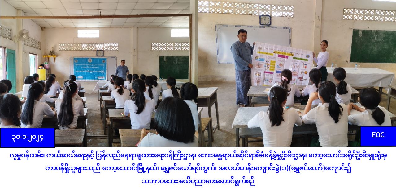 လူမှုဝန်ထမ်း၊ ကယ်ဆယ်ရေးနှင့် ပြန်လည်နေရာချထားရေးဝန်ကြီးဌာန၊ ဘေးအန္တရာယ်ဆိုင်ရာစီမံခန့်ခွဲမှုဦးစီးဌာန၊ ကော့သောင်းခရိုင်ဦးစီးမှူးရုံးမှ တာဝန်ရှိသူများသည် (၃၀-၁-၂၀၂၄)ရက်နေ့၊ နံနက်(၁၀း၀၀)နာရီအချိန်တွင် ကော့သောင်းမြို့နယ်၊ ရွှေဇင်ယော်ရပ်ကွက်၊ အလယ်တန်းကျောင်းခွဲ(၁)(ရွှေဇင်ယော်)ကျောင်း၌ ကျောင်းသား/သူ(၁၀၀)ဦးအား သဘာဝဘေးအန္တရာယ်နှင့်ပတ်သက်၍ ဆောင်ရန်၊ ရှောင်ရန်အကြောင်းသိကောင်းစရာများနှင့် ဦးစီးဌာန၏ လုပ်ငန်းတာဝန်များအား ရှင်းလင်းပြောကြာခြင်း၊ လက်ကမ်းစာစောင်များဖြန့်ဝေခြင်းတို့ ဆောင်ရွက်ခဲ့ကြောင်း သိရှိရပါသည်။