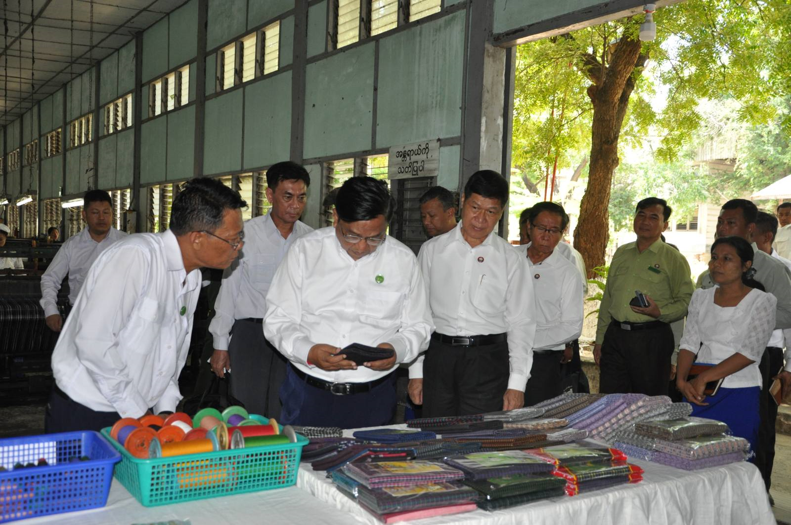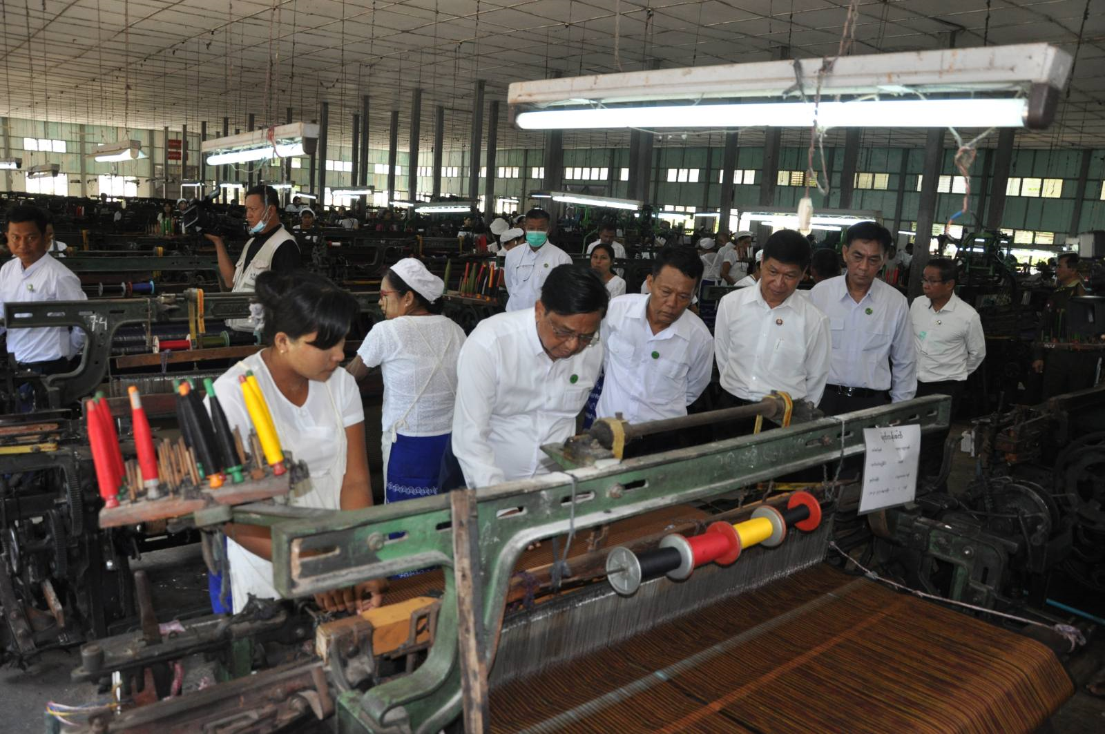 ဆက်လက်၍ ပြည်ထောင်စုဝန်ကြီးနှင့် မန္တလေးတိုင်းဒေသကြီးအစိုးရအဖွဲ့ ဝန်ကြီးချုပ်တို့သည် အမှတ်(၇)အထည်စက်ရုံခွဲ (ဝမ်းတွင်း) သို့ ရောက်ရှိရာ စက်ရုံတာဝန်ခံက စက်ရုံဆိုင်ရာအချက်အလက်များ၊ လုပ်ငန်းလည်ပတ် အကောင်အထည်ဖော်ဆောင်ရွက်နေမှု၊ ၂/၈၀ ချည်များဖြင့် ပုဆိုးများရက်လုပ်နေမှုအခြေအနေများကို ရှင်းလင်းတင်ပြရာ ပြည်ထောင်စုဝန်ကြီးက ဈေးကွက်အားခြေခံ၍ ကုန်ထုတ်လုပ်မှုလုပ်ငန်းများကိုဆောင်ရွက်ရန်၊ အထည်များ ရက်လုပ်ရာတွင် ဝယ်ယူသူများကို ဆွဲဆောင်နိုင်သည့် အရောင်၊ အဆင်ဒီဇိုင်းများဖြစ်အောင် ဆောင်ရွက်ရန်နှင့် ထုပ်ပိုးမှုပုံစံများကိုလည်း စနစ်တကျ ကောင်းမွန်အောင်ဆောင်ရွက်ရန် လမ်းညွှန်မှာကြားပြီး ၂/၈၀ ချည်များဖြင့် အထည်များ ရက်လုပ်နေသည့်အခြေအနေများကို လှည့်လည်ကြည့်ရှုစစ်ဆေးခဲ့ကြောင်း သတင်းရရှိသည်။