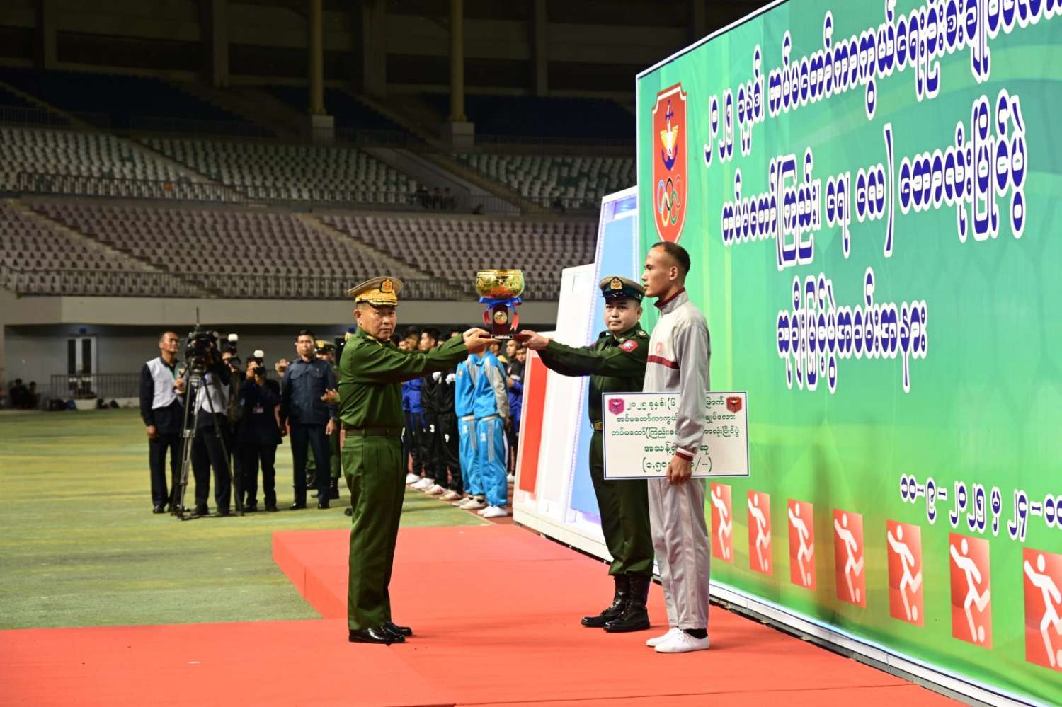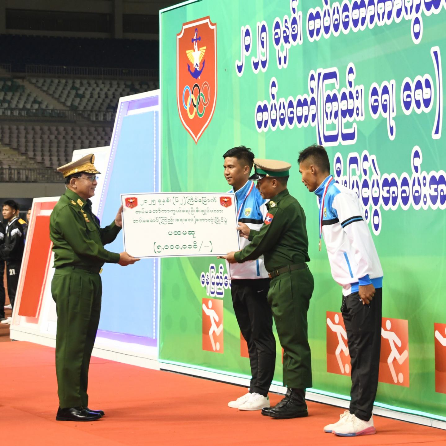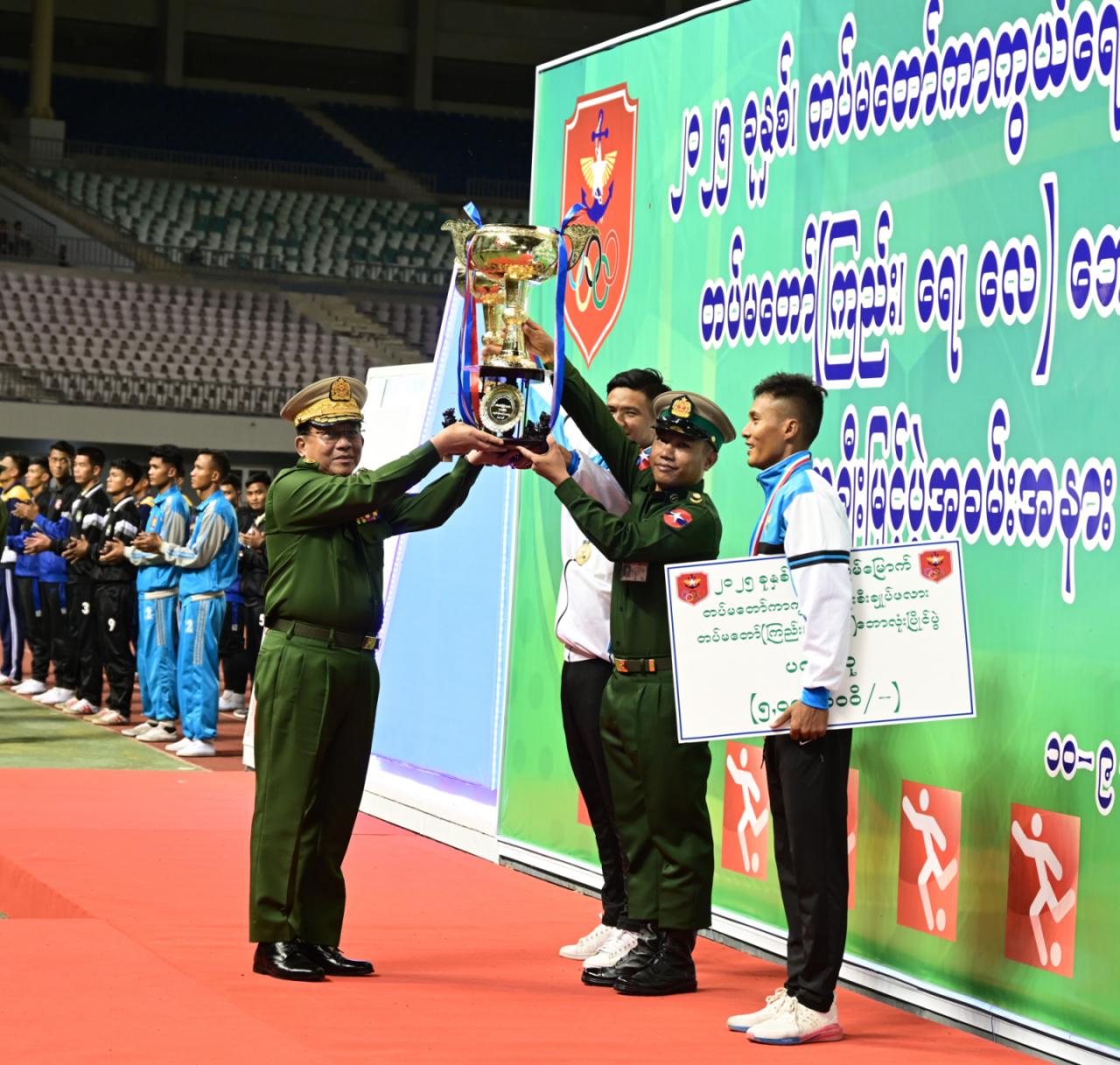 နိုင်ငံတော်လုံခြုံရေးနှင့် အေးချမ်းသာယာရေးကော်မရှင်ဥက္ကဋ္ဌ တပ်မတော် ကာကွယ်ရေးဦးစီးချုပ် ဗိုလ်ချုပ်မှူးကြီး မင်းအောင်လှိုင် ၂၀၂၅ ခုနှစ်၊ (၆၂) ကြိမ်မြောက် တပ်မတော်ကာကွယ်ရေးဦးစီးချုပ်ဖလား တပ်မတော် (ကြည်း၊ ရေ၊ လေ) ဘောလုံးပြိုင်ပွဲ ဗိုလ်လုပွဲနှင့်ဆုချီးမြှင့်ပွဲ အခမ်းအနားသို့တက်ရောက်၍ ဆုများပေးအပ်ချီးမြှင့်