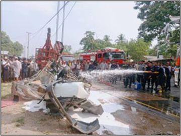 ၂၀၂၅ ခုနှစ်၊ မတ် ၁၈ ရက် နံနက် ၈ နာရီ ၅၀ မိနစ်ခန့်က ပဲခူးတိုင်းဒေသကြီး၊ ပဲခူးမြို့နယ်၊ ဘုရားကြီးနယ်မြေ၊ ဝမ်းဘဲအင်းကျေးရွာ၊ ရန်ကုန်-မန္တလေးလမ်းဟောင်းတွင် ပဲခူးမှ ဒိုက်ဦးသို့ ယာဉ်မောင်း ဦးသိန်းဇော် မောင်းနှင်လာသော ယာဉ်အမှတ် YGN-22/ 8E-XXXX TOWNACE အမျိုးအစား အဖြူရောင် မော်တော်ယာဉ်သည် ဒေးစွန်ပါဘုရားသို့ ကွေ့ဝင်စဉ် ပဲခူးမှ ဒိုက်ဦးသို့ ယာဉ်မောင်း ဦးအောင်ကိုမင်း မောင်းနှင်လာသော MDY-18/ 5S-XXXX ဒေါင်ဖန်း ဆီဘောက်ဆာယာဉ်နှင့် တိုက်မိမှုဖြစ်ပွားကြောင်း သတင်းရရှိသဖြင့် ပဲခူးမြို့နယ်မီးသတ်စခန်းမှ မီးသတ်တပ်ဖွဲ့ဝင်များသည် မီးသတ်ယာဉ် သုံးစီးဖြင့် ရှာဖွေကယ်ဆယ်ရေးလုပ်ငန်းများ သွားရောက်ဆောင်ရွက်ခဲ့ရာ နံနက် ၉ နာရီ ၅၅ မိနစ်တွင် ပြီးစီးခဲ့ပါသည်။