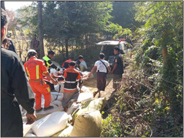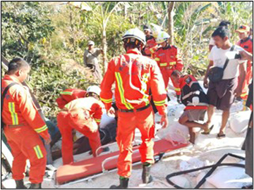 ပဲခူးတိုင်းဒေသကြီး၊ ပန်းတောင်းမြို့နယ်၊ ဆင်တဲကျေးရွာအုပ်စု၊ နဝဒေးချဉ်းကပ်လမ်း၊ မိုင်တိုင်အမှတ် ၅ မိုင် ၁ ဖာလုံနှင့် ၂ ဖာလုံကြားတွင် ယာဉ်တိမ်းမှောက်မှုဖြစ်ပွားသဖြင့် ရှာဖွေကယ်ဆယ်ရေးလုပ်ငန်းများ သွားရောက်ဆောင်ရွက်မှု