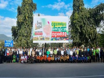 ရှမ်းပြည်နယ်၊ တာချီလိတ်မြို့နယ်၊ ဆန်ဆိုင်း(ခ)ရပ်ကွက်၊ ဗိုလ်ချုပ်လမ်းမကြီးဘေး၌ ရွေးကောက်ပွဲတွင် မဲဆန္ဒရှင်ပြည်သူများအားလုံး ပါဝင်မဲပေးနိုင်ရေးအတွက် ဗီနိုင်းပိုစတာ စိုက်ထူခြင်းနှင့် လက်ကမ်းစာစောင်များ ဖြန့်ဝေ