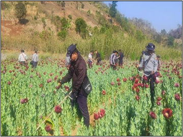 ၂၀၂၅ ခုနှစ်၊ မတ် ၁၁ ရက်က ရှမ်းပြည်နယ်(တောင်ပိုင်း)၊ ဟိုပုံးမြို့နယ်၌ ရဲတပ်ဖွဲ့ဝင်များ၊ နယ်မြေခံတပ်မတော်သားများ၊ ဌာနဆိုင်ရာဝန်ထမ်းများပါဝင်သော ပူးပေါင်းအဖွဲ့မှ ဘိန်းခင်းဖျက်ဆီးခြင်းများ ဆောင်ရွက်ခဲ့ကြောင်း သိရသည်။