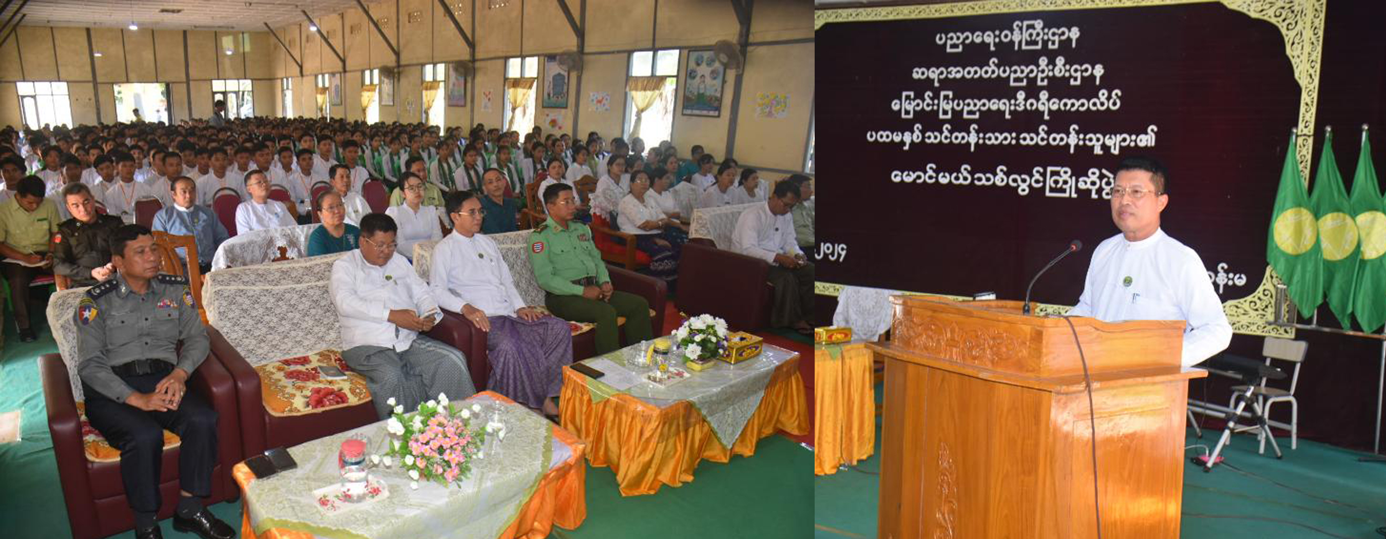 ထို့နောက် တိုင်းဒေသကြီးဝန်ကြီးချုပ်က“ တိုင်းဒေသကြီးအတွက် အားထားရသည့် ဆရာ၊ ဆရာများဖြစ်လာကြမည့် မောင်တို့မယ်တို့အား ရင်းနှီးနွေးထွေးစွာကြိုဆိုခြင်းဖြစ်ပါကြောင်း၊ တိုင်းဒေသကြီးသည် မြေခံရေခံကောင်းမွန်ပြီး လူ့စွမ်းအားအရင်းအမြစ်များပေါများကာ ပညာရေးကိုလိုလားသည့် တိုင်းဒေသကြီးဖြစ်ပါကြောင်း၊ တိုင်းဒေသကြီးအစိုးရအဖွဲ့အနေဖြင့် ကျောင်းနေအရွယ်ကလေးအားလုံး ရာနှုန်းပြည့်ကျောင်းတက်ရောက်စေရေးနှင့် အတန်းစဉ်ကူးပြောင်းမှုများ မကျန်ရှိစေရေးအတွက် သက်ဆိုင်ရာ တာဝန်ရှိသူများနှင့် ပူးပေါင်းဆောင်ရွက်လျက်ရှိပါကြောင်း၊ ကျောင်းသား၊ ကျောင်းသူများသည် ဆရာ၊ ဆရာမများ၏ သွန်သင်ဆုံးမမှုများအောက်တွင် ကြီးပြင်းကြရမည့်သူများဖြစ်ပါကြောင်း၊ တပည့်များ၏ ကိုယ်ရည်ကိုယ်သွေးနှင့် စွမ်းရည်သတ္တိများ မြင့်သည်ထက်မြင့်အောင် ပြုစုပျိုးထောင်ပေးကြရမည့်သူများဖြစ်ပါကြောင်း၊ အများအကျိုးအတွက် ကိုယ်ကျိုးမဖက် ဆောင်ရွက်တတ်သူများလည်း ဖြစ်ကြပါကြောင်း၊ မိမိတို့၏ တပည့်များအားသင်ကြားပေးရမည့် ဆရာ၊ ဆရာများသည် ထူးထူးချွန်ချွန်ထက်ထက်မြက်မြက်ဖြစ်အောင် ဦးစွာကြိုးစားသင်ယူလေ့လာကြရမည်ဖြစ်ပါကြောင်း၊ နိုင်ငံတော်နှင့်တိုင်းဒေသကြီးအတွက် အားကိုးအားထားပြု နိုင်သည့် ဆရာ၊ ဆရာမများ ဖြစ်စေရေးကြိုးစားကြရန်လိုအပ်သကဲ့သို့ ဗလငါးတန်နှင့်ပြည့်စုံသည့်လူငယ်လူရွယ်များဖြစ်အောင် ပြုစုပျိုးထောင်နိုင်ကြသည့် ဆရာ၊ ဆရာမများဖြစ်ကြပါစေကြောင်း” တိုက်တွန်းအမှာစကားပြောကြားခဲ့ပြီး ကျောင်းသား၊ကျောင်းသူများ အတွက် ထောက်ပံ့ငွေများပေးအပ်ရာ မြောင်းမြပညာရေးဒီဂရီကောလိပ်မှ ကျောင်းအုပ်ကြီးက လက်ခံရယူခဲ့သည်။ ထို့နောက် တိုင်းဒေသကြီးဝန်ကြီးချုပ်နှင့်တာဝန်ရှိသူများသည် ကျောင်းသား၊ ကျောင်းသူများနှင့်အတူ ရင်းရင်းနှီးနှီး နေ့လယ်စာ အတူတကွ သုံးဆောင်ခဲ့ပါသည်။