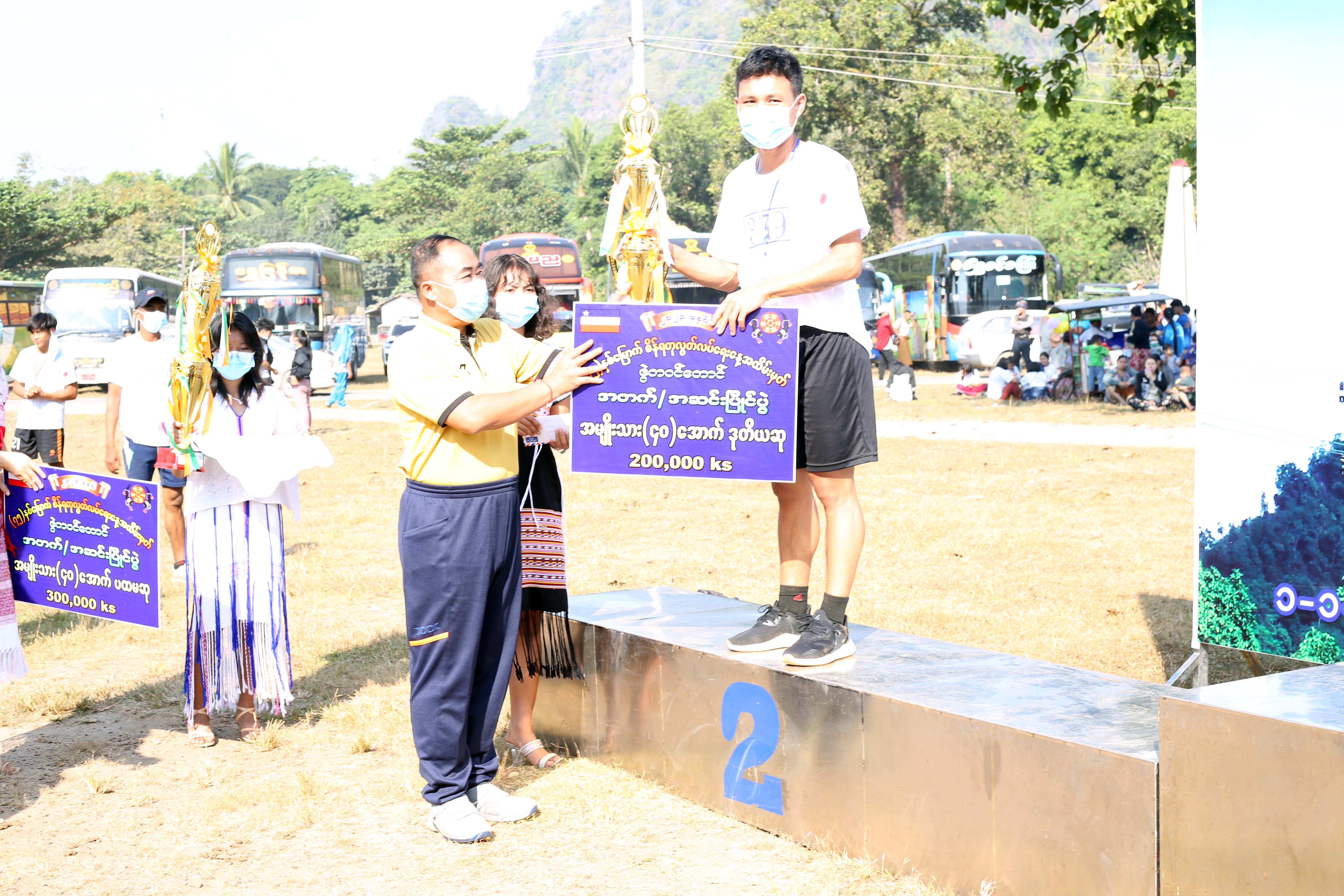 ထို့နောက် ဆုချီးမြှင့်ပွဲအခမ်းအနားကို ကျင်းပရာ ပြည်နယ်လူမှုရေးရာဝန်ကြီးဦးစိုးလွင်က ဇွဲကပင်တောင် တက်/တောင်ဆင်းပြိုင်ပွဲတွင် အသက်အကြီးဆုံးဖြင့်ပါဝင်ယှဉ်ပြိုင်သော အသက် ၇၈ နှစ်မှ ၆၀ နှစ်ထိ အဘိုး ၇ ဦးအား ဂုဏ်ပြုဆုများကိုလည်းကောင်း၊ ပြည်နယ်စီးပွားရေးရာဝန်ကြီး၏ဇနီးဒေါ်နန်းမြင့်မြင့်အေးက အသက် ၇၀ မှ ၅၁ နှစ်ထိ အဘွား ၇ ဦးတို့အား ဂုဏ်ပြုဆုများကိုလည်းကောင်း ပေးအပ်ချီးမြှင့်ကြသည်။