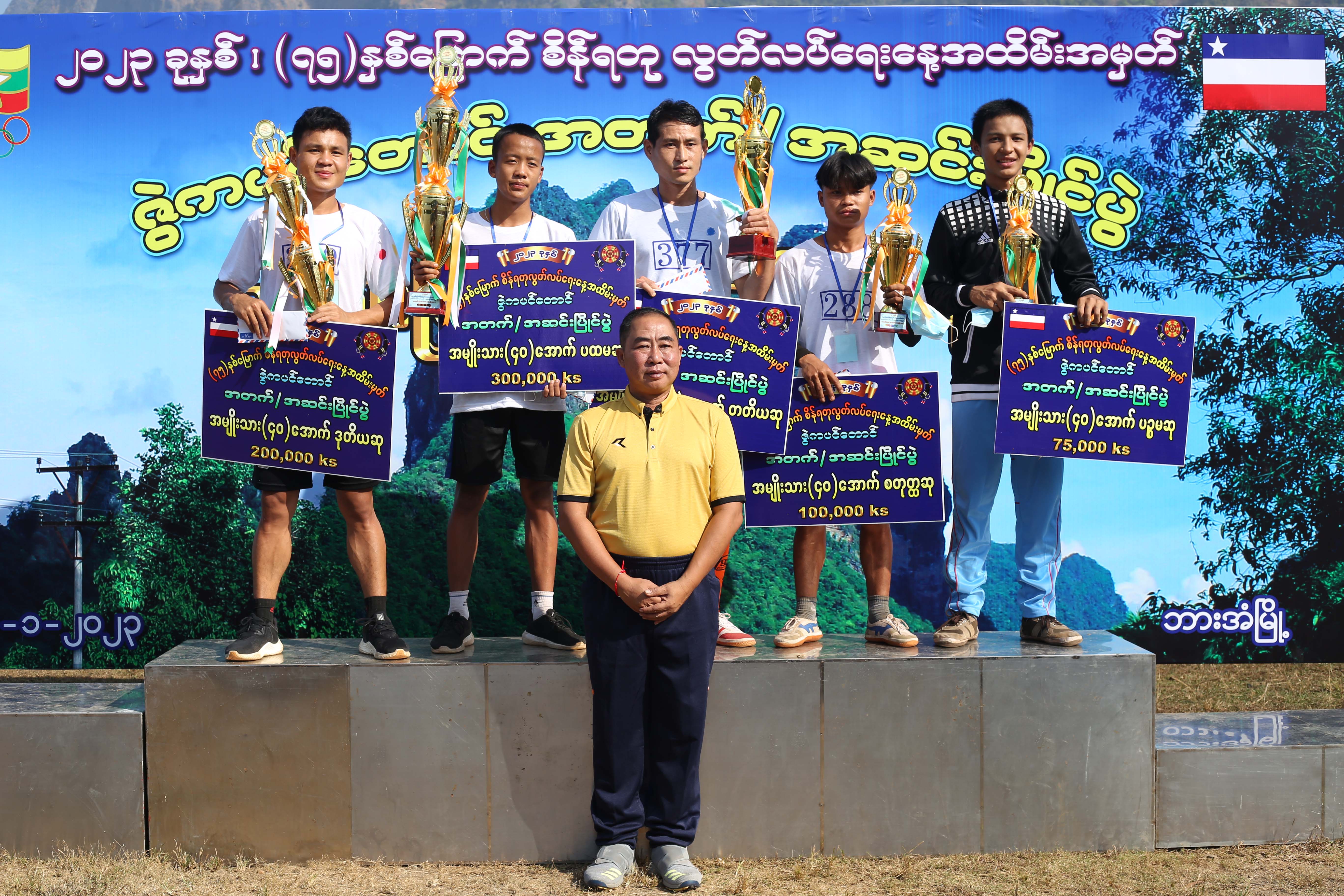 ယင်းနောက် ဇွဲကပင်တောင်တက်/တောင်ဆင်းပြိုင်ပွဲတွင် အသက်အပိုင်းအခြား၊ ပြိုင်ပွဲအမျိုးအစားအလိုက် ပထမဆုမှ နှစ်သိမ့်ဆုထိ ဆုပေါင်း(၂၀)ဆုမှ (၃၅)ဆုထိချီးမြှင့်ပေးခဲ့ရာ ပြည်နယ်အစိုးရအဖွဲ့ဝင်များနှင့် ၎င်းတို့၏ ဇနီးများက အသက်အပိုင်းအခြားပြိုင်ပွဲအလိုက် ဆုများပေးအပ်ချီးမြှင့်ခဲ့ကြပြီး ပြည်နယ်သယံဇာတရေးရာဝန်ကြီး၏ ဇနီးက အသက်(၄၀)နှစ်အထက်အမျိုးသမီးပြိုင်ပွဲတွင် ပထမဆုမှပဥ္စမဆုရရှိသူများအား ငွေသားဆုနှင့်ဆုဖလားများကို လည်းကောင်း၊ ပြည်နယ်စီးပွားရေးရာဝန်ကြီးဦးစောခင်မောင်မြင့်က အသက်(၄၀)နှစ်အထက် အမျိုးသားပြိုင်ပွဲတွင် ပထမဆုမှပဥ္စမဆုရရှိသူများအားငွေသားဆုနှင့်ဆုဖလားများကိုလည်းကောင်း၊ ပြည်နယ်စီးပွားရေးရာဝန်ကြီး၏ ဇနီး က အသက်(၄၀)နှစ်အောက် အမျိုးသမီးပြိုင်ပွဲတွင် ပထမဆုမှပဥ္စမဆုရရှိသူများအား ငွေသားဆုနှင့်ဆုဖလားများကို လည်းကောင်း အသီးသီးပေးအပ်ချီးမြှင့်ခဲ့ကြကာ ကရင်ပြည်နယ်ဝန်ကြီးချုပ်(ကိုယ်စား) ပြည်နယ်လုံခြုံရေးနှင့် နယ်စပ်ရေးရာဝန်ကြီးဗိုလ်မှူးကြီးမျိုးမင်းနောင်က အသက်(၄၀)နှစ်အောက် အမျိုးသားပြိုင်ပွဲတွင် ပထမဆုမှပဥ္စမဆု ရရှိသူများအား ငွေသားဆုနှင့်ဆုဖလားများကို ပေးအပ်ချီးမြှင့်ခဲ့ပါသည်။