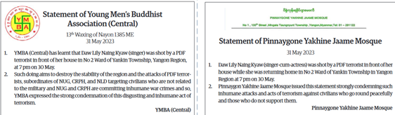 On 30 May, a male PDF terrorist gunned down singer-cum-actress Daw Lily Naing Soe (aka) Lily Naing Kyaw of 58, who lives in No.2 Ward of Yankin Township in Thingangyun district of Yangon Region and fled from the spot. Since Daw Lily Naing Kyaw got serious bullet wound in her right temple during the incident, she is undergoing medical treatment at the military hospital in Mingaladon Township.