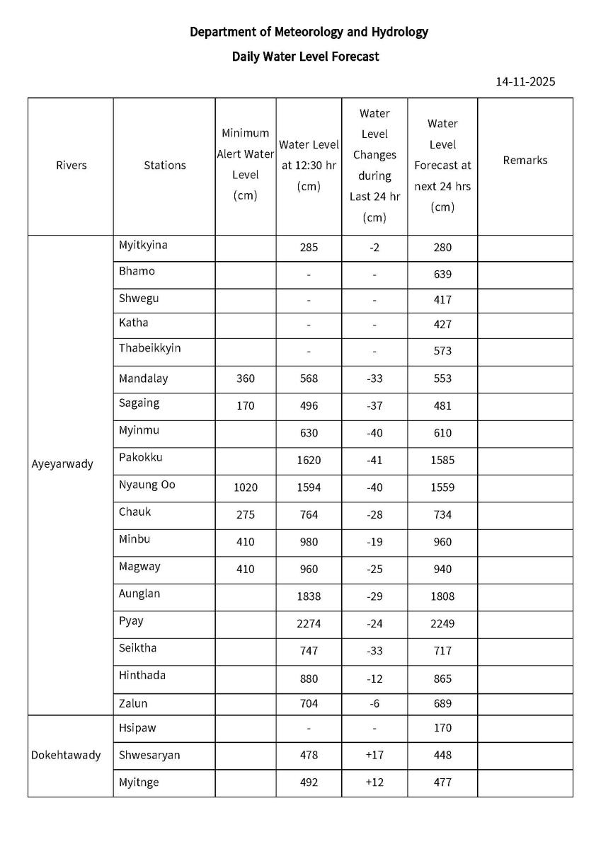 Daily Water Level Forecast (Issued at 14:00 hr MST on 14-11-2025)