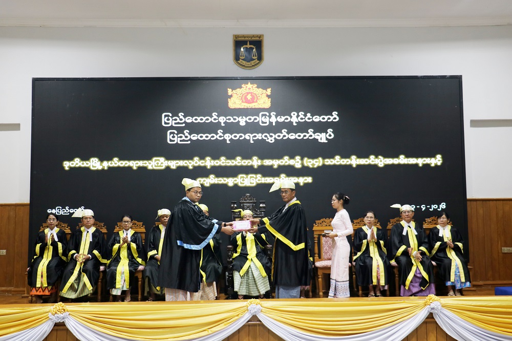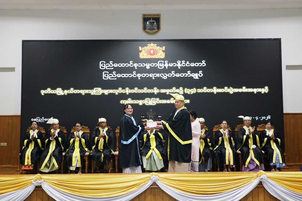 And then, under section 23 Sub-Section (c) (i) of the Union Judiciary Law, in accordance with the provision provided that the Supreme Court of the Union is to arrange for any new judges to take an oath or affirmation at the time of assigning duty, the recruited judicial officers took an oath in the presence of the Union Chief Justice and the Justices of the Supreme Court of the Union “we ourselves by declaring solemnly and sincerely that we will be upholding and abiding by the Constitution of the Union and the existing laws; and will be adjudicating the cases fairly and rightly in accordance with law by following the Code of Judicial Conduct and by abstaining from four kinds of prejudices while carrying out our judicial functions”.