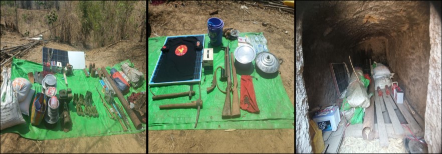 On 1 May at 0800 AM, while security personnel carrying out security measures near Latpwa Village in Mindon Township, Magway Region, a homemade percussion lock firearm, two homemade mines, a homemade grenade, two visses of gun powder, 20 ticals of Sulphur, two fuse coils and related materials were found and seized in an 8-foot-length, 4-foot-width, and 4-foot-height tunnel-shaped ground hole, which was being used as a camp by a so-called PDF terrorist group, located in a forest approximately one mile east of the Village. After inspecting the surrounding area, a homemade gun, a wooden short frame of a gun, a black short shirt with PDF logo and related materials were found and seized near a bush, it is reported.