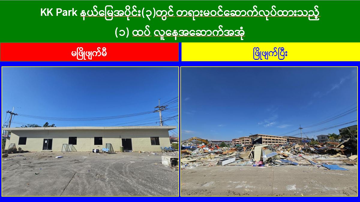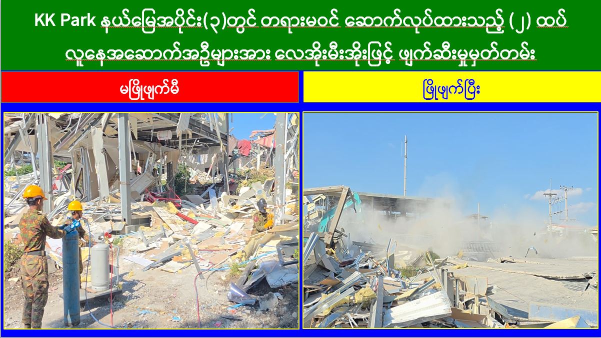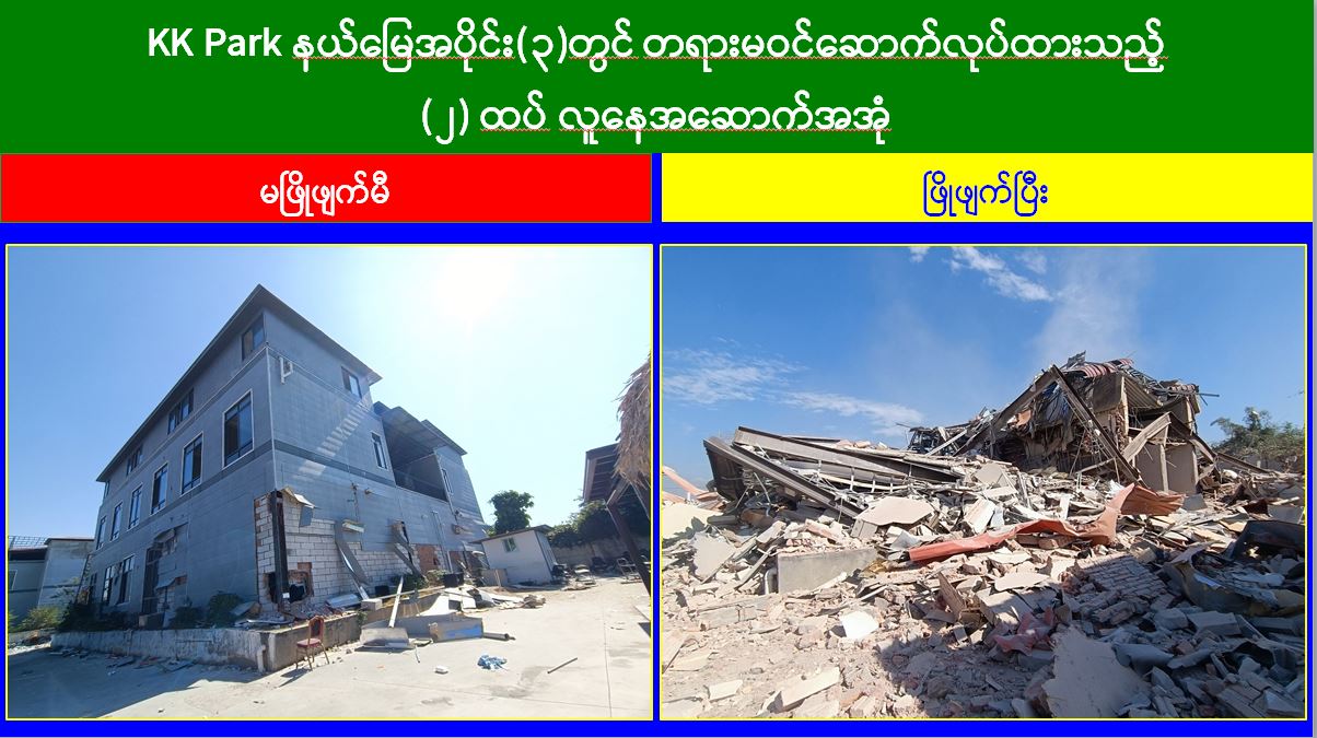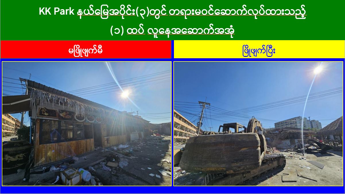 မြန်မာနိုင်ငံအစိုးရအနေဖြင့် အွန်လိုင်းလိမ်လည်လောင်းကစားမှုများ အများဆုံးအခြေချလုပ်ကိုင်လျက်ရှိကြသည့် ရွှေကုက္ကိုလ်နယ်မြေနှင့် KK Park နယ်မြေများရှိ တရားမဝင်အဆောက်အအုံများအတွင်း ဝင်ရောက်ရှင်းလင်းခြင်း၊ အွန်လိုင်းလိမ်လည်လောင်းကစားမှုလုပ်ငန်းစဉ်များတွင် အသုံးပြုခဲ့သည့် သိမ်းဆည်းရမိပစ္စည်းများနှင့် တရားမဝင်အဆောက်အအုံများအား စနစ်တကျဖြိုချဖျက်ဆီးခြင်းများကို လုံခြုံရေးတပ်ဖွဲ့ဝင်များ၊ အုပ်ချုပ်ရေးအဖွဲ့အစည်းများနှင့် ဒေသတွင်းတာဝန်ရှိသူများအပါအဝင် အဖွဲ့စုံပါဝင်သည့် ပူးပေါင်းအဖွဲ့ဖြင့် ဆောင်ရွက်လျက်ရှိရာ ယနေ့တွင် KK Park နယ်မြေအတွင်းရှိ တရားမဝင်အဆောက်အအုံ ၆ လုံးကို ထပ်မံဖြိုချဖျက်ဆီးခဲ့ကြောင်း သိရှိရသည်။