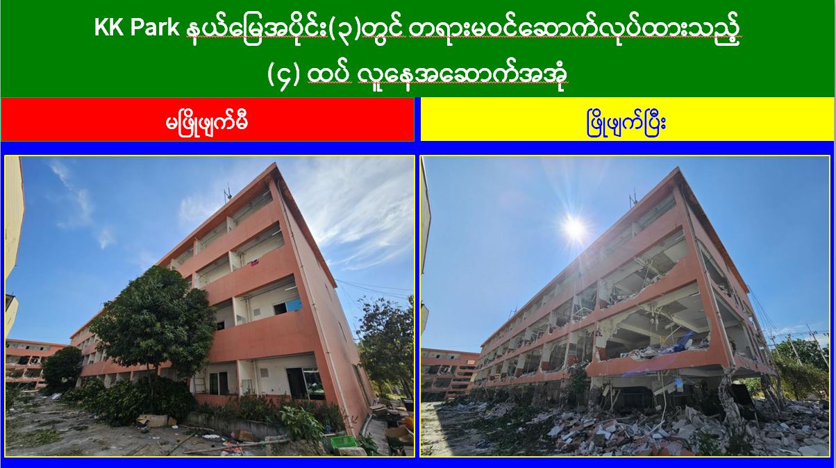 ယနေ့တွင် မြဝတီ-မဲထော်သလေး (KK Park) အပိုင်း (၃) နယ်မြေအတွင်းရှိ အွန်လိုင်းလိမ်လည်လောင်းကစားမှုများ ကျူးလွန်ရာတွင် အသုံးပြုခဲ့သည့် တရားမဝင် ၄ ထပ် အဆောက်အအုံ ၁ လုံး၊ ၂ ထပ်အဆောက်အအုံ ၂ လုံးနှင့် ၁ ထပ်အဆောက်အအုံ ၃ လုံး စုစုပေါင်း တရားမဝင် အဆောက်အအုံ ၆ လုံးတို့ကို ထပ်မံဖြိုချဖျက်ဆီးခဲ့သဖြင့် KK Park နယ်မြေအတွင်းရှိ တရားမဝင်အဆောက်အအုံ စုစုပေါင်း ၆၃၅ လုံးအနက် ၅၂၅ လုံးကို စနစ်တကျဖြိုချဖျက်ဆီးပြီးဖြစ်ကြောင်း သိရှိရသည်။