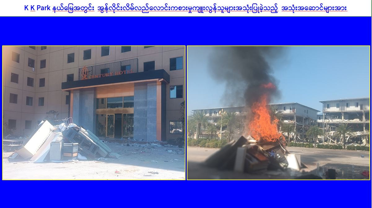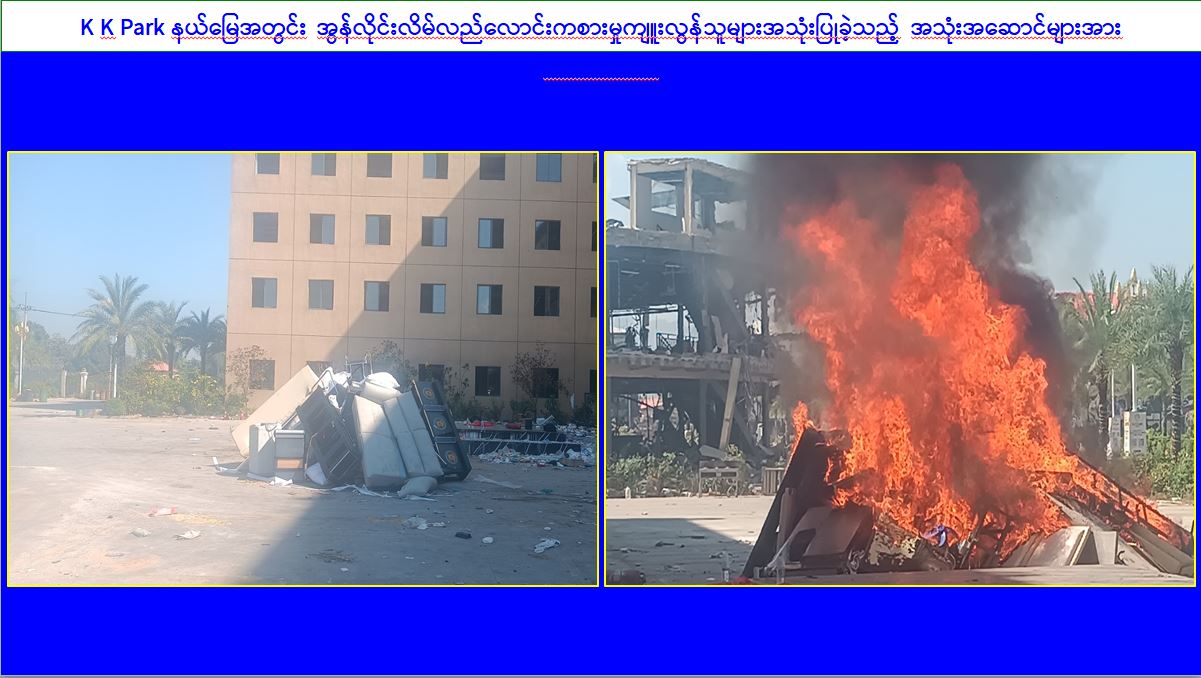 ၎င်းအပြင် KK park နယ်မြေအတွင်းရှိ အွန်လိုင်းလိမ်လည် လောင်းကစားမှုကျူးလွန်ရာတွင် အသုံးပြုခဲ့သည့် ပစ္စည်းများအား ထပ်မံအသုံးပြုမှုမရှိစေရေးအတွက် ယနေ့တွင်လည်း စနစ်တကျမီးရှို့ဖျက်ဆီးခဲ့ကြောင်းနှင့် နိုင်ငံတော်အစိုးရအနေဖြင့် အွန်လိုင်းလိမ်လည်လောင်းကစားမှု ကျူးလွန်မှုများကို အမျိုးသားရေးတာဝန်တစ်ရပ် အဖြစ်ခံယူကာ မြန်မာနိုင်ငံအတွင်း လုံးဝအခြေမပြုနိုင်ရေး ပြည်တွင်းအင်အားစုများအပြင် အိမ်နီးချင်းနိုင်ငံအစိုးရများနှင့်လည်း ပေါင်းစပ်ညှိနှိုင်း၍ ဆက်လက်ဆောင်ရွက်သွားမည်ဖြစ်ကြောင်း သတင်းရရှိသည်။