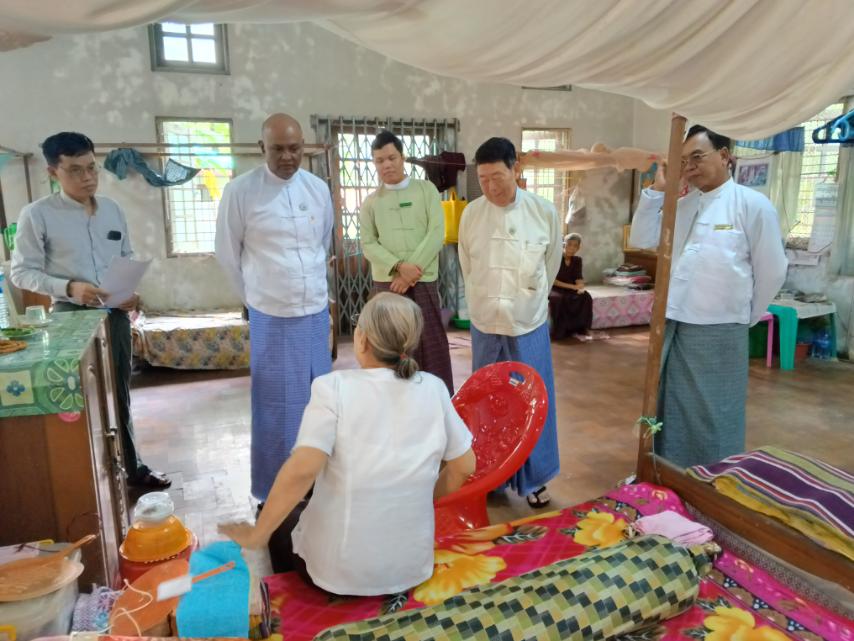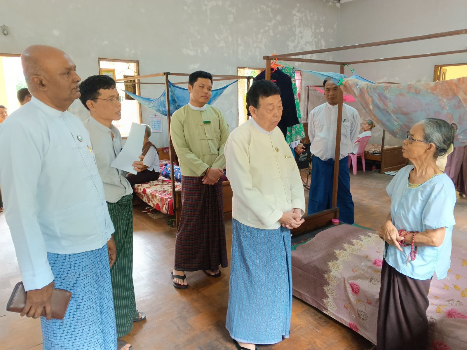 During the visit at Kyauktan Home for the Aged, the inspection team met with the elderly residents in their living quarters and assessed a range of conditions, including the provision of healthcare services, food and nutritional support, access to clean drinking and household water, freedom of religion and belief, and the overall hygiene and sanitation standards of dormitories, bathrooms, toilets, and kitchens. They also inquired about arrangements for recreation and relaxation, occasional counselling, the accessibility of pension payments for eligible residents, and the availability of social pension support for those aged 85 and above. The team extended warm words of encouragement to the (22) elderly individuals residing at the facility.