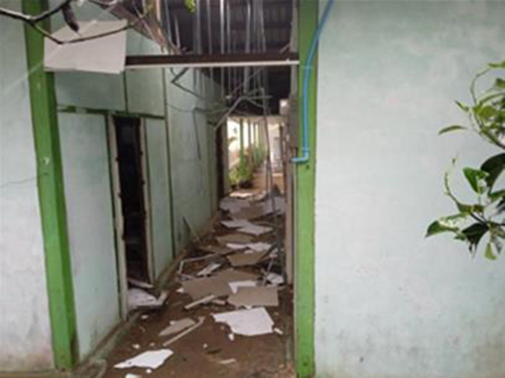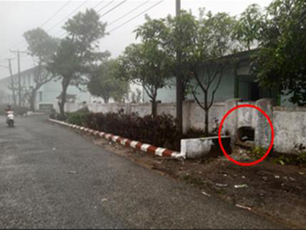 သံတောင်ကြီးမြို့၊ အမှတ်(၂)ရပ်ကွက်ရှိ အခြေခံပညာအထက်တန်းကျောင်းခြံစည်းရိုးအနီး၌ အကြမ်းဖက် သမားများ၏ မိုင်းဖောက်ခွဲမှုကြောင့် ပျက်စီးခဲ့မှု မှတ်တမ်းဓာတ်ပုံ။