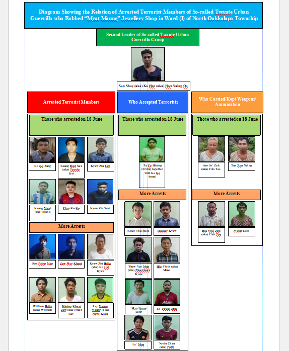According to the arrested perpetrators, security personnel arrested the second leader of the terrorist group called Twante Urban Guerrilla San Shay (aka) Ko Htet (aka) Htet Naing Oo and other related perpetrators Hla Myo Zaw (aka) Chit Htoo, Myint Lwin, Thaw Ray Mu (aka) Phoe Thoutkyar, Lae Pwe Mu and Lal Mu and Nyein Chan (aka) Pathi, who kept San Shay to stay at their home and to hide arms and ammo at Yay Kyaw Su village of Twante Township on 23 June. Along with them, one Sig Sauer pistol, one Pietro Beretta pistol, one Beretta pistol, three pistol magazines and 30 rounds of 9 mm, one hand-grenade and two homemade grenades were also seized. In the evening on that day, additional terrorist member Lay Mg Mg (aka) Shwe Kun was arrested.