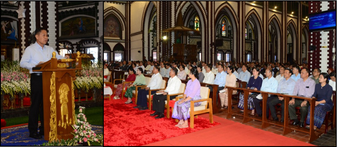 The ceremony was held at St. Mary’s Cathedral, and Archbishop U Myat Hsan said the opening prayer, Auxiliary Bishop Noel Saw Naw Aye extended greetings, and the hymn “Then Jesus Came” was sung in chorus. In his Christmas Day address, the Vice-Senior General highlighted the following points;