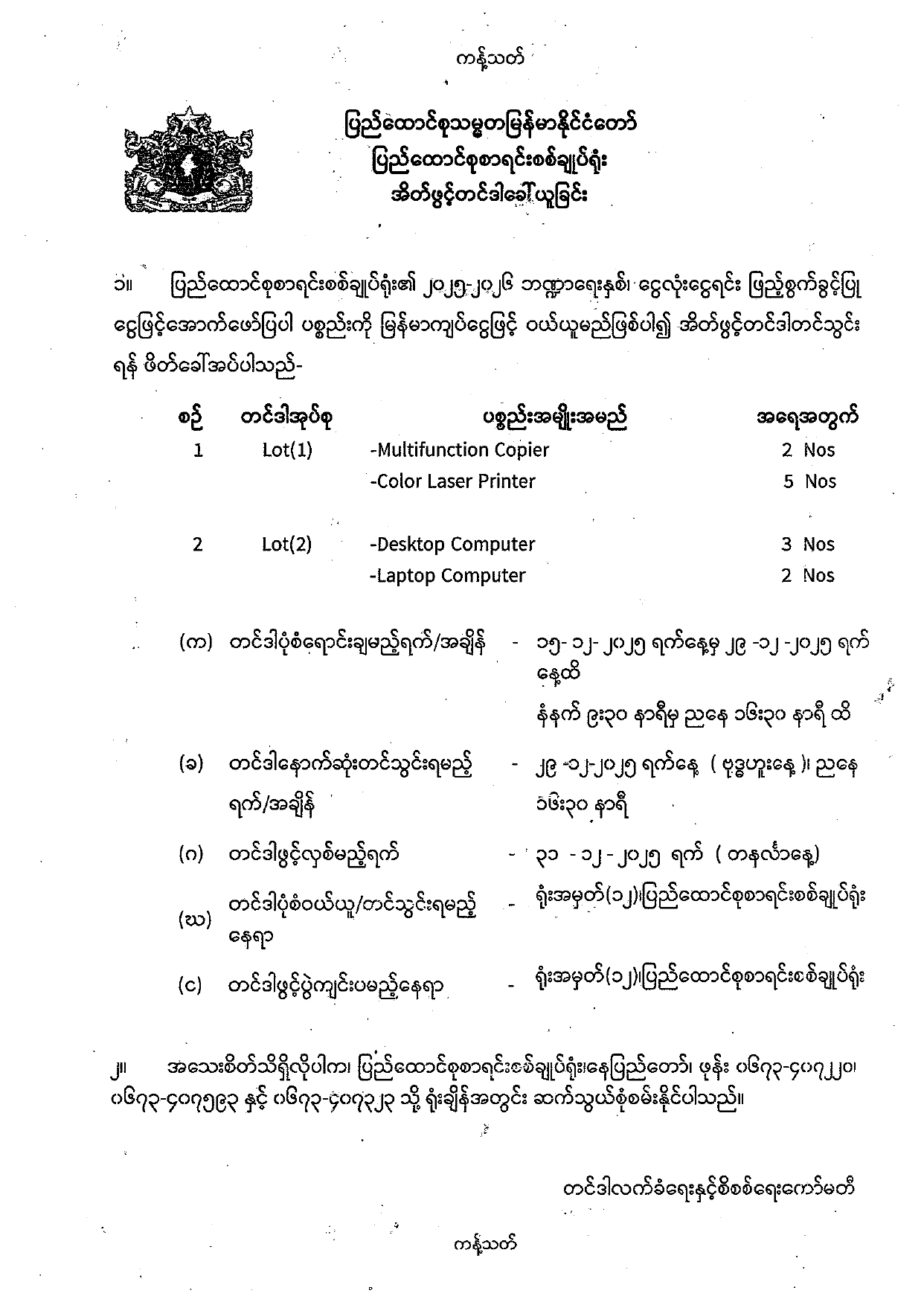 ပြည်ထောင်စုစာရင်းစစ်ချုပ်ရုံး ၊ Multifunction Copier, Color Laser Printer, Desktop Computer and Laptop Computer အိတ်ဖွင့်တင်ဒါခေါ်ယူခြင်း