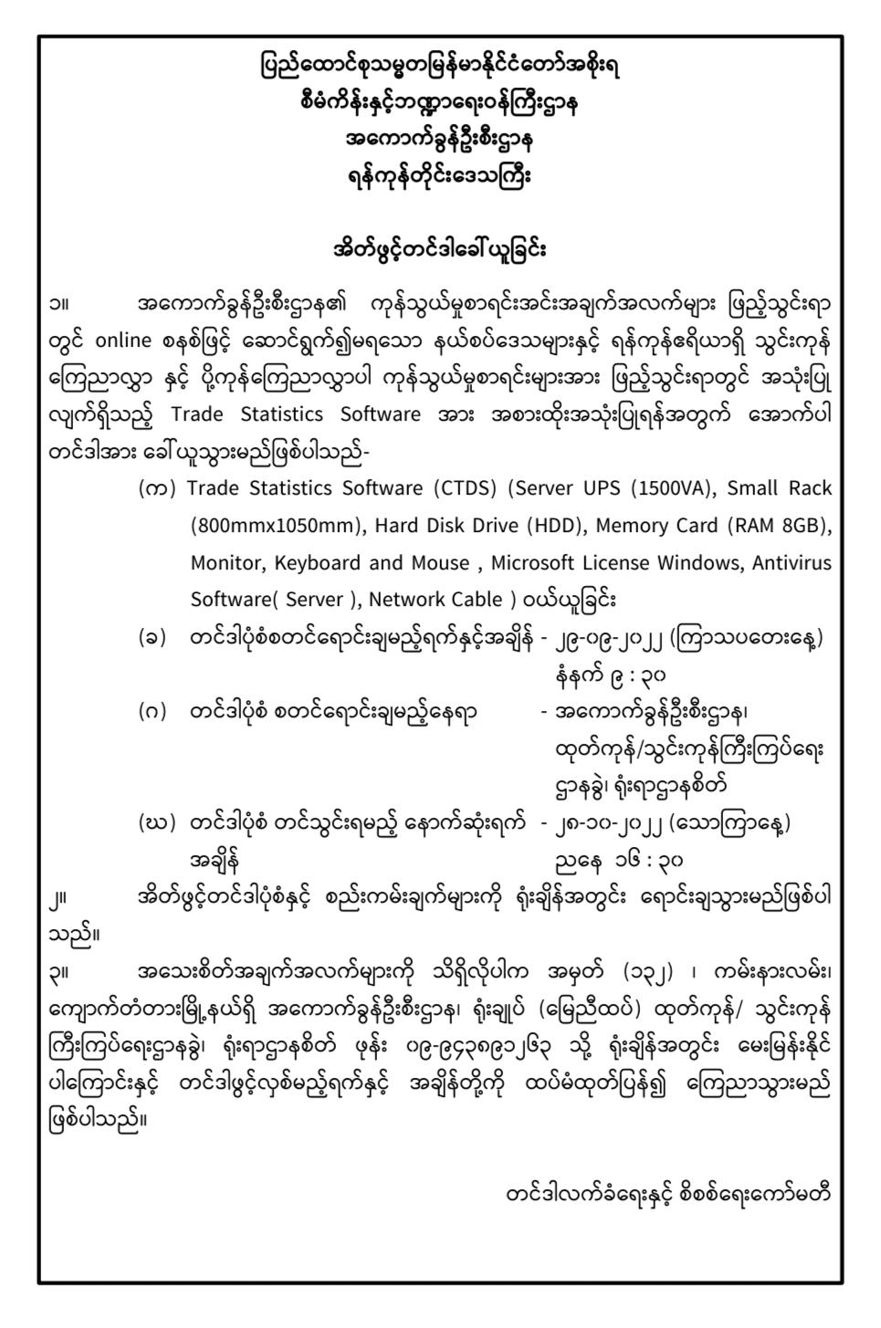 အကောက်ခွန်ဦးစီးဌာန၏ Trade Statistics Software ဆောင်ရွက်ရန်အတွက် အိတ်ဖွင်တင်ဒါခေါ်ယူခြင်း